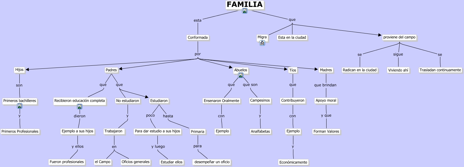 Este Cmap, tiene información relacionada con: FAMILIA, Ejemplo a sus hijos y ellos Fueron profesionales, Para dar estudio a sus hijos y luego Estudiar ellos, Apoyo moral y que Forman Valores, Tíos que Contribuyeron, Conformada por Abuelos, FAMILIA que Esta en la ciudad, Ensenaron Oralmente con Ejemplo, FAMILIA que proviene del campo, Primeros bachilleres y Primeros Profesionales, FAMILIA esta Conformada, Ejemplo y Económicamente, Estudiaron hasta Primaria, Conformada por Madres, Madres que brindan Apoyo moral, Recibieron educación completa dieron Ejemplo a sus hijos, Padres que No estudiaron, Padres que Recibieron educación completa, proviene del campo sigue Viviendo ahí, Campesinos y Analfabetas, No estudiaron y Trabajaron