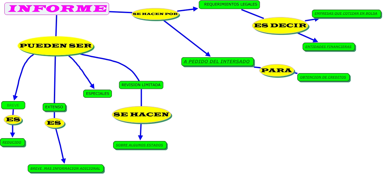 Este mapa conceptual tiene información relacionada a: NIEVES - INFORME, REVISION LIMITADA PUEDEN SER BREVE, INFORME SE HACEN POR REQUERIMIENTOS LEGALES, INFORME SE HACEN POR A PEDIDO DEL INTERSADO, INFORME PUEDEN SER BREVE, REQUERIMIENTOS LEGALES ES DECIR EMPRESAS QUE COTIZAN EN BOLSA, EXTENSO PUEDEN SER ESPECIALES, EXTENSO PUEDEN SER BREVE, EXTENSO ES BREVE MAS INFORMACION ADICIONAL, A PEDIDO DEL INTERSADO PARA OBTENCION DE CREDITOS, REQUERIMIENTOS LEGALES ES DECIR ENTIDADES FINANCIERAS