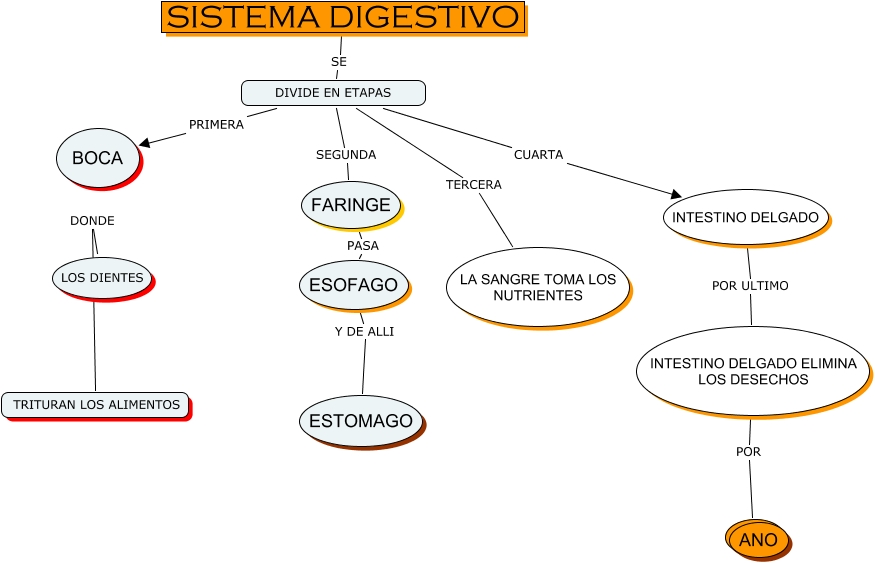 Este mapa conceptual tiene información relacionada a: NANCY, LOS DIENTES DONDE TRITURAN LOS ALIMENTOS, DIVIDE EN ETAPAS SEGUNDA FARINGE, DIVIDE EN ETAPAS CUARTA INTESTINO DELGADO, INTESTINO DELGADO POR ULTIMO INTESTINO DELGADO ELIMINA LOS DESECHOS, INTESTINO DELGADO ELIMINA LOS DESECHOS POR ????, DIVIDE EN ETAPAS PRIMERA BOCA, FARINGE PASA ESOFAGO, DIVIDE EN ETAPAS TERCERA LA SANGRE TOMA LOS NUTRIENTES, SISTEMA DIGESTIVO SE DIVIDE EN ETAPAS, ESOFAGO Y DE ALLI ESTOMAGO
