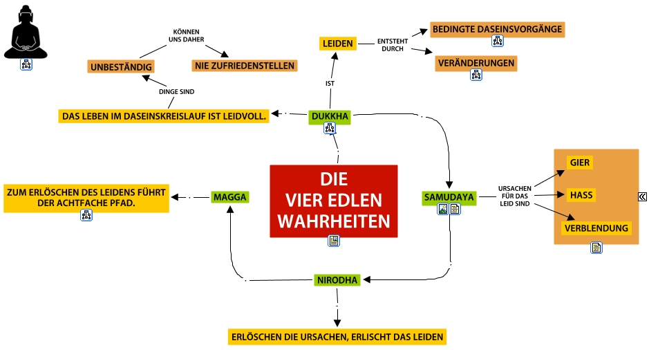 Dieses mit IHMC CmapTools erstellte CMap hat Informationen bezüglich: 4_edlen_Wahrheiten, LEIDEN ENTSTEHT DURCH BEDINGTE DASEINSVORGÄNGE, SAMUDAYA URSACHEN FÜR DAS LEID SIND GIER, DIE VIER EDLEN WAHRHEITEN . DUKKHA, UNBESTÄNDIG KÖNNEN UNS DAHER NIE ZUFRIEDENSTELLEN, SAMUDAYA URSACHEN FÜR DAS LEID SIND VERBLENDUNG, SAMUDAYA . NIRODHA, DUKKHA . DAS LEBEN IM DASEINSKREISLAUF IST LEIDVOLL., NIRODHA . MAGGA, DAS LEBEN IM DASEINSKREISLAUF IST LEIDVOLL. DINGE SIND UNBESTÄNDIG, SAMUDAYA URSACHEN FÜR DAS LEID SIND HASS, MAGGA . ZUM ERLÖSCHEN DES LEIDENS FÜHRT DER ACHTFACHE PFAD., DUKKHA IST LEIDEN, DUKKHA . SAMUDAYA, NIRODHA - ERLÖSCHEN DIE URSACHEN, ERLISCHT DAS LEIDEN, LEIDEN ENTSTEHT DURCH VERÄNDERUNGEN