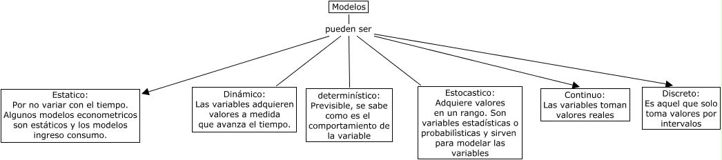 Este mapa conceptual tiene información relacionada a: Otros modelos, Modelos pueden ser determinístico: Previsible, se sabe como es el comportamiento de la variable, Modelos pueden ser Estocastico: Adquiere valores en un rango. Son variables estadísticas o probabilìsticas y sirven para modelar las variables, Modelos pueden ser Continuo: Las variables toman valores reales, Modelos pueden ser Estatico: Por no variar con el tiempo. Algunos modelos econometricos son estáticos y los modelos ingreso consumo., Modelos pueden ser Dinámico: Las variables adquieren valores a medida que avanza el tiempo., Modelos pueden ser Discreto: Es aquel que solo toma valores por intervalos
