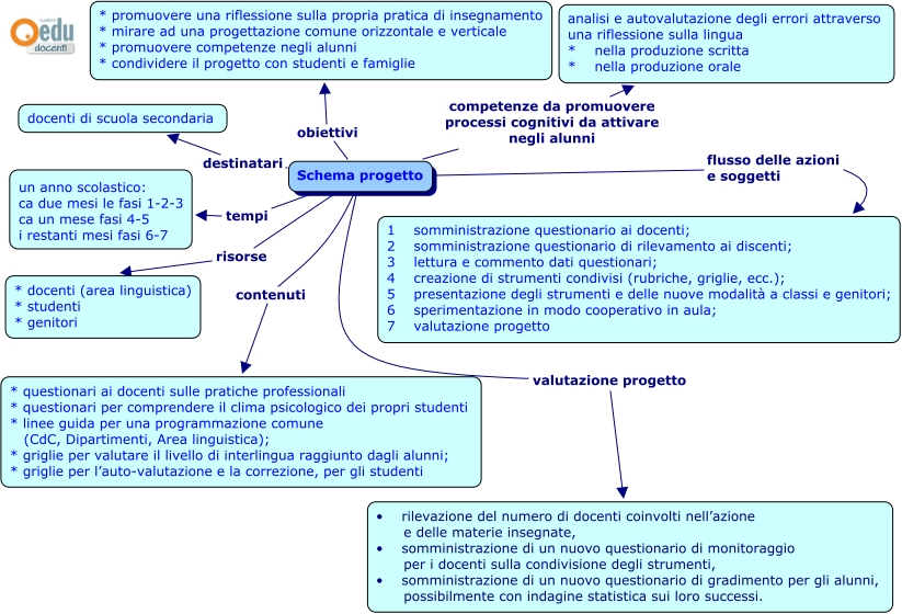 Questa Cmap, creata con IHMC CmapTools, contiene informazioni relative a: schema progetto, Schema progetto contenuti * questionari ai docenti sulle pratiche professionali * questionari per comprendere il clima psicologico dei propri studenti * linee guida per una programmazione comune (CdC, Dipartimenti, Area linguistica); * griglie per valutare il livello di interlingua raggiunto dagli alunni; * griglie per l’auto-valutazione e la correzione, per gli studenti, Schema progetto destinatari docenti di scuola secondaria, Schema progetto valutazione progetto • rilevazione del numero di docenti coinvolti nell’azione e delle materie insegnate, • somministrazione di un nuovo questionario di monitoraggio per i docenti sulla condivisione degli strumenti, • somministrazione di un nuovo questionario di gradimento per gli alunni, possibilmente con indagine statistica sui loro successi., Schema progetto tempi un anno scolastico: ca due mesi le fasi 1-2-3 ca un mese fasi 4-5 i restanti mesi fasi 6-7, Schema progetto flusso delle azioni e soggetti 1 somministrazione questionario ai docenti; 2 somministrazione questionario di rilevamento ai discenti; 3 lettura e commento dati questionari; 4 creazione di strumenti condivisi (rubriche, griglie, ecc.); 5 presentazione degli strumenti e delle nuove modalità a classi e genitori; 6 sperimentazione in modo cooperativo in aula; 7 valutazione progetto, Schema progetto competenze da promuovere processi cognitivi da attivare negli alunni analisi e autovalutazione degli errori attraverso una riflessione sulla lingua * nella produzione scritta * nella produzione orale, Schema progetto risorse * docenti (area linguistica) * studenti * genitori, Schema progetto obiettivi * promuovere una riflessione sulla propria pratica di insegnamento * mirare ad una progettazione comune orizzontale e verticale * promuovere competenze negli alunni * condividere il progetto con studenti e famiglie
