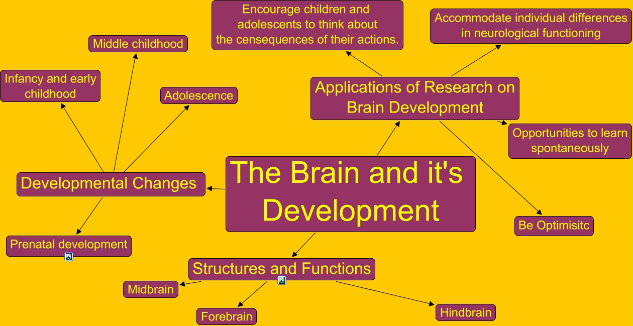 This Concept Map, created with IHMC CmapTools, has information related to: The Brain and it's Development, Developmental Changes Adolescence, Developmental Changes Prenatal development, Developmental Changes Infancy and early childhood, Developmental Changes Middle childhood, Structures and Functions Hindbrain, Applications of Research on Brain Development Opportunities to learn spontaneously, Applications of Research on Brain Development Be Optimisitc, Applications of Research on Brain Development Accommodate individual differences in neurological functioning, The Brain and it's Development Applications of Research on Brain Development, Applications of Research on Brain Development Encourage children and adolescents to think about the censequences of their actions., Structures and Functions Forebrain, The Brain and it's Development Structures and Functions, The Brain and it's Development Developmental Changes, Structures and Functions Midbrain