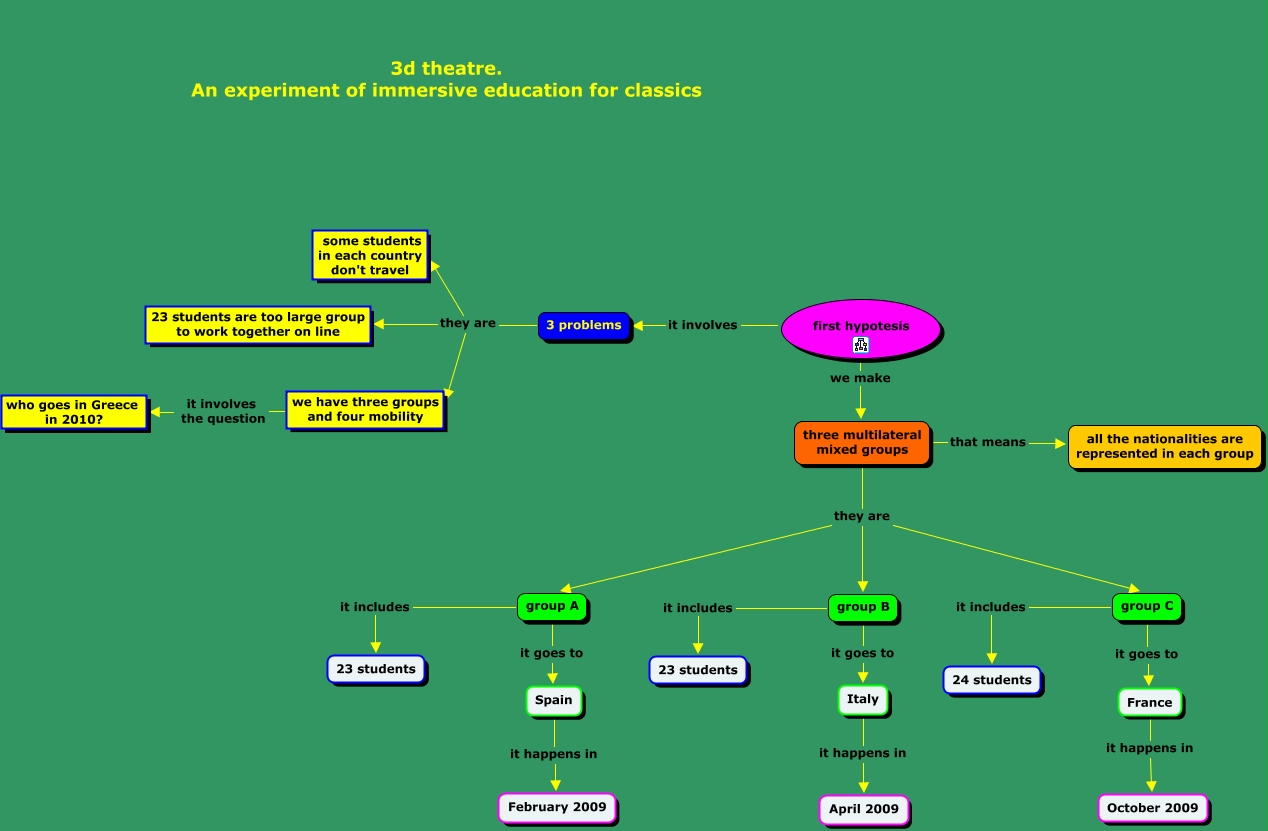 Mobility 1, Spain it happens in February 2009, 3 problems they are we have three groups and four mobility, we have three groups and four mobility it involves the question who goes in Greece in 2010?, three multilateral mixed groups they are group C, first hypotesis it involves 3 problems, group C it includes 24 students, group A it includes 23 students, group C it goes to France, three multilateral mixed groups they are group B, 3 problems they are 23 students are too large group to work together on line