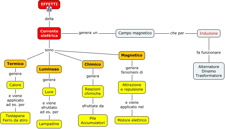 Questa Cmap, creata con IHMC CmapTools, contiene informazioni relative a: Effetti della corrente elettrica, Reazioni chimiche sfruttate da Pile Accumulatori, EFFETTI della Corrente elettrica, Luminoso genera Luce, Magnetico genera fenomeni di Attrazione e repulsione, Corrente elettrica sono Luminoso, Termico genera Calore, Attrazione e repulsione e viene applicato nel Motore elettrico, Corrente elettrica sono Chimico, Luce e viene sfruttato ad es. per Lampadine, Induzione fa funzionare Alternatore Dinamo Trasformatore, Campo magnetico che per Induzione, Corrente elettrica genera un Campo magnetico, Chimico genera Reazioni chimiche, Corrente elettrica sono Termico, Corrente elettrica sono Magnetico, Calore e viene applicato ad es. per Tostapane Ferro da stiro