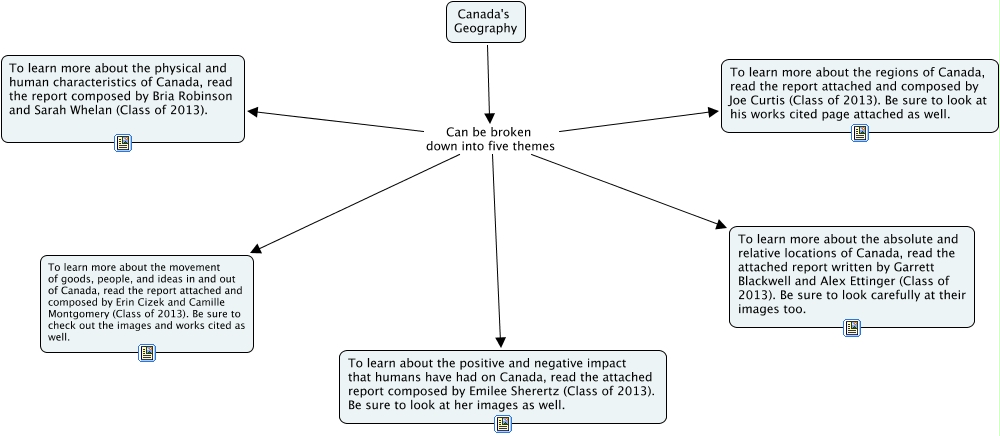 This Concept Map, created with IHMC CmapTools, has information related to: Canada's Geography(1), Canada's Geography Can be broken down into five themes To learn more about the regions of Canada, read the report attached and composed by Joe Curtis (Class of 2013). Be sure to look at his works cited page attached as well., Canada's Geography Can be broken down into five themes To learn more about the physical and human characteristics of Canada, read the report composed by Bria Robinson and Sarah Whelan (Class of 2013)., Canada's Geography Can be broken down into five themes To learn about the positive and negative impact that humans have had on Canada, read the attached report composed by Emilee Sherertz (Class of 2013). Be sure to look at her images as well., Canada's Geography Can be broken down into five themes To learn more about the movement of goods, people, and ideas in and out of Canada, read the report attached and composed by Erin Cizek and Camille Montgomery (Class of 2013). Be sure to check out the images and works cited as well., Canada's Geography Can be broken down into five themes To learn more about the absolute and relative locations of Canada, read the attached report written by Garrett Blackwell and Alex Ettinger (Class of 2013). Be sure to look carefully at their images too.