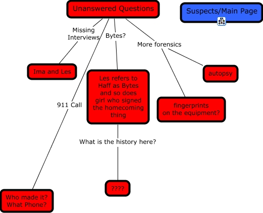 This Concept Map, created with IHMC CmapTools, has information related to: Questions, Unanswered Questions More forensics fingerprints on the equipment?, Unanswered Questions Bytes? Les refers to Haff as Bytes and so does girl who signed the homecoming thing, Les refers to Haff as Bytes and so does girl who signed the homecoming thing What is the history here? ????, Unanswered Questions More forensics autopsy, Unanswered Questions Missing Interviews Ima and Les, Unanswered Questions 911 Call Who made it? What Phone?