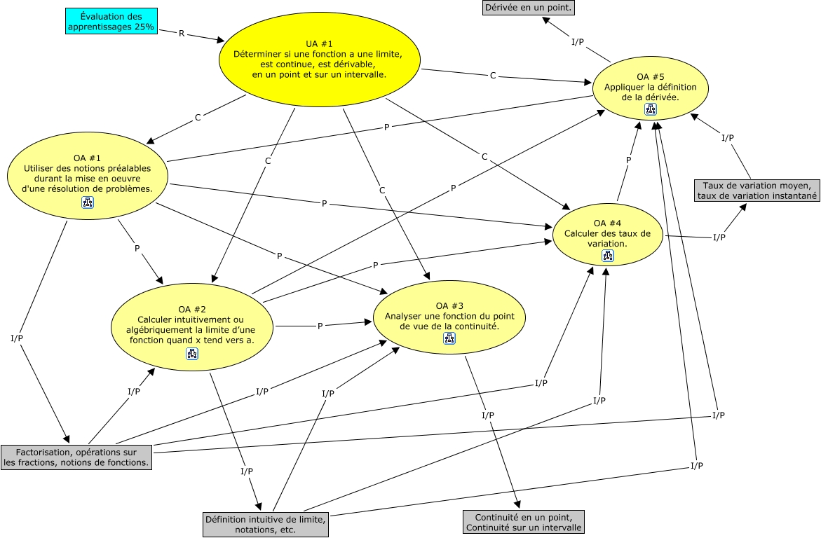 Cette carte conceptuelle, cree avec IHMC CmapTools, contient des informations liees a : UA1, Définition intuitive de limite, notations, etc. I/P OA #4 Calculer des taux de variation., OA #2 Calculer intuitivement ou algébriquement la limite d’une fonction quand x tend vers a. P OA #3 Analyser une fonction du point de vue de la continuité., Factorisation, opérations sur les fractions, notions de fonctions. I/P OA #2 Calculer intuitivement ou algébriquement la limite d’une fonction quand x tend vers a., OA #5 Appliquer la définition de la dérivée. I/P Dérivée en un point., Évaluation des apprentissages 25% R UA #1 Déterminer si une fonction a une limite, est continue, est dérivable, en un point et sur un intervalle., UA #1 Déterminer si une fonction a une limite, est continue, est dérivable, en un point et sur un intervalle. C OA #1 Utiliser des notions préalables durant la mise en oeuvre d'une résolution de problèmes., OA #2 Calculer intuitivement ou algébriquement la limite d’une fonction quand x tend vers a. I/P Définition intuitive de limite, notations, etc., OA #1 Utiliser des notions préalables durant la mise en oeuvre d'une résolution de problèmes. P OA #5 Appliquer la définition de la dérivée., Factorisation, opérations sur les fractions, notions de fonctions. I/P OA #5 Appliquer la définition de la dérivée., OA #1 Utiliser des notions préalables durant la mise en oeuvre d'une résolution de problèmes. P OA #3 Analyser une fonction du point de vue de la continuité., Définition intuitive de limite, notations, etc. I/P OA #3 Analyser une fonction du point de vue de la continuité., Taux de variation moyen, taux de variation instantané I/P OA #5 Appliquer la définition de la dérivée., OA #4 Calculer des taux de variation. P OA #5 Appliquer la définition de la dérivée., UA #1 Déterminer si une fonction a une limite, est continue, est dérivable, en un point et sur un intervalle. C OA #5 Appliquer la définition de la dérivée., OA #1 Utiliser des notions préalables durant la mise en oeuvre d'une résolution de problèmes. I/P Factorisation, opérations sur les fractions, notions de fonctions., Factorisation, opérations sur les fractions, notions de fonctions. I/P OA #4 Calculer des taux de variation., OA #4 Calculer des taux de variation. I/P Taux de variation moyen, taux de variation instantané, UA #1 Déterminer si une fonction a une limite, est continue, est dérivable, en un point et sur un intervalle. C OA #2 Calculer intuitivement ou algébriquement la limite d’une fonction quand x tend vers a., OA #1 Utiliser des notions préalables durant la mise en oeuvre d'une résolution de problèmes. P OA #4 Calculer des taux de variation., OA #2 Calculer intuitivement ou algébriquement la limite d’une fonction quand x tend vers a. P OA #4 Calculer des taux de variation.