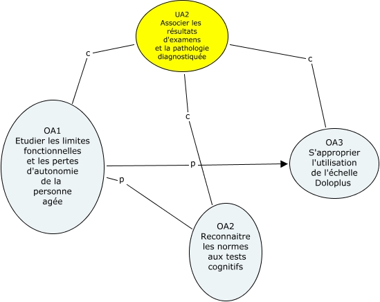 Cette carte conceptuelle, cree avec IHMC CmapTools, contient des informations liees a : UA2, OA1 Etudier les limites fonctionnelles et les pertes d'autonomie de la personne agée p OA3 S'approprier l'utilisation de l'échelle Doloplus, UA2 Associer les résultats d'examens et la pathologie diagnostiquée c OA1 Etudier les limites fonctionnelles et les pertes d'autonomie de la personne agée, UA2 Associer les résultats d'examens et la pathologie diagnostiquée c OA2 Reconnaitre les normes aux tests cognitifs, OA1 Etudier les limites fonctionnelles et les pertes d'autonomie de la personne agée p OA2 Reconnaitre les normes aux tests cognitifs, UA2 Associer les résultats d'examens et la pathologie diagnostiquée c OA3 S'approprier l'utilisation de l'échelle Doloplus