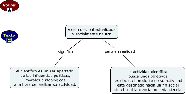 Este Cmap, tiene información relacionada con: visión descontextualizada y socialmente neutra, Visión descontextualizada y socialmente neutra significa el científico es un ser apartado de las influencias políticas, morales e ideológicas a la hora de realizar su actividad., Visión descontextualizada y socialmente neutra pero en realidad la actividad científica busca unos objetivos, es decir, el producto de su actividad esta destinado hacia un fin social sin el cual la ciencia no seria ciencia.