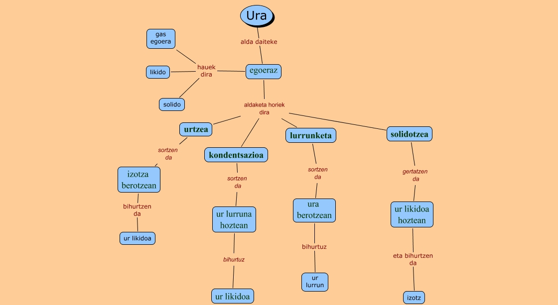 Este Cmap, tiene información relacionada con: uraren egoerak, solidotzea gertatzen da ur likidoa hoztean, lurrunketa sortzen da ura berotzean, kondentsazioa sortzen da ur lurruna hoztean, egoeraz hauek dira likido, ur lurruna hoztean bihurtuz ur likidoa, egoeraz hauek dira solido, Ura alda daiteke egoeraz, urtzea sortzen da izotza berotzean, egoeraz aldaketa horiek dira solidotzea, egoeraz aldaketa horiek dira lurrunketa, ur likidoa hoztean eta bihurtzen da izotz, egoeraz hauek dira gas egoera, egoeraz aldaketa horiek dira kondentsazioa, ura berotzean bihurtuz ur lurrun, izotza berotzean bihurtzen da ur likidoa, egoeraz aldaketa horiek dira urtzea