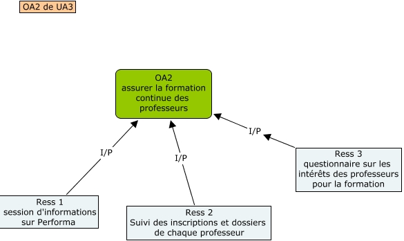 Cette carte conceptuelle, cree avec IHMC CmapTools, contient des informations liees a : OA2 de UA3, Ress 3 questionnaire sur les intérêts des professeurs pour la formation I/P OA2 assurer la formation continue des professeurs