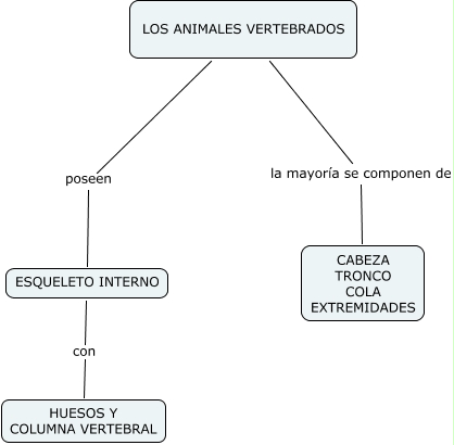 Este mapa conceptual tiene información relacionada a: caracteristicas de los vertebrados, LOS ANIMALES VERTEBRADOS la mayoría se componen de CABEZA TRONCO COLA EXTREMIDADES, LOS ANIMALES VERTEBRADOS poseen ESQUELETO INTERNO, ESQUELETO INTERNO con HUESOS Y COLUMNA VERTEBRAL