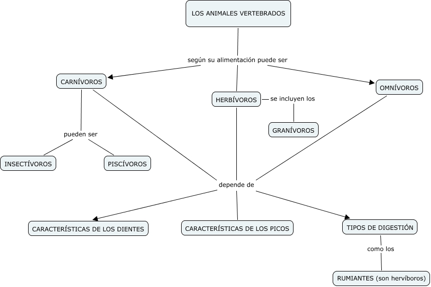 Este mapa conceptual tiene información relacionada a: según su alimentación, HERBÍVOROS depende de CARACTERÍSTICAS DE LOS PICOS, CARNÍVOROS pueden ser PISCÍVOROS, OMNÍVOROS depende de TIPOS DE DIGESTIÓN, CARNÍVOROS depende de CARACTERÍSTICAS DE LOS PICOS, LOS ANIMALES VERTEBRADOS según su alimentación puede ser OMNÍVOROS, OMNÍVOROS depende de CARACTERÍSTICAS DE LOS DIENTES, HERBÍVOROS depende de CARACTERÍSTICAS DE LOS DIENTES, LOS ANIMALES VERTEBRADOS según su alimentación puede ser HERBÍVOROS, LOS ANIMALES VERTEBRADOS según su alimentación puede ser CARNÍVOROS, OMNÍVOROS depende de CARACTERÍSTICAS DE LOS PICOS, HERBÍVOROS se incluyen los GRANÍVOROS, CARNÍVOROS depende de CARACTERÍSTICAS DE LOS DIENTES, HERBÍVOROS depende de TIPOS DE DIGESTIÓN, CARNÍVOROS pueden ser INSECTÍVOROS, TIPOS DE DIGESTIÓN como los RUMIANTES (son hervíboros), CARNÍVOROS depende de TIPOS DE DIGESTIÓN