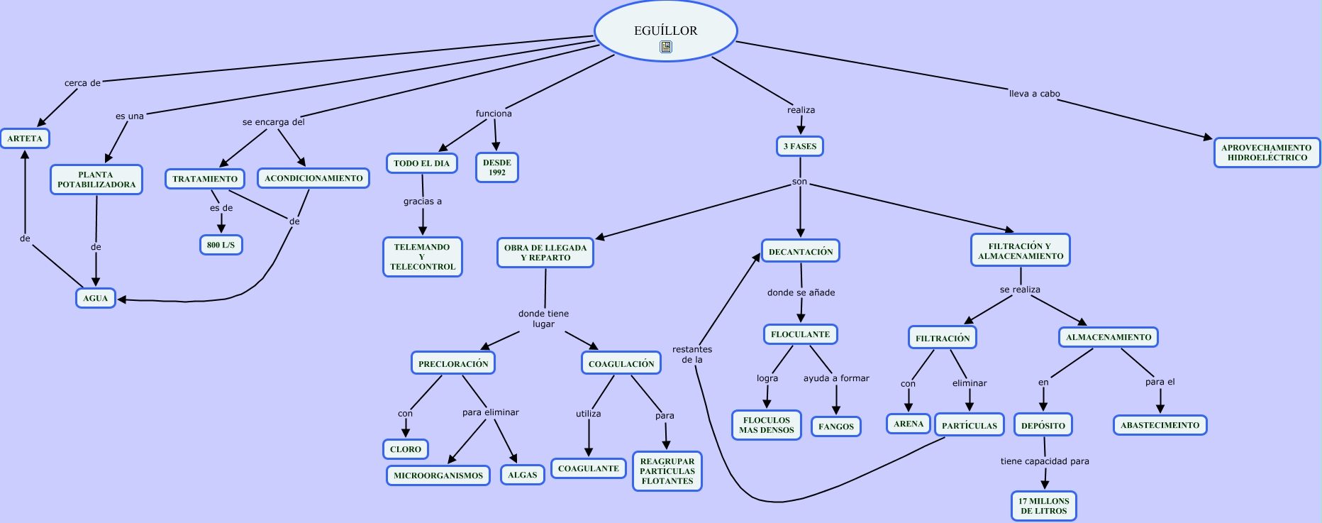 Este Cmap, tiene información relacionada con: Eguillor, PLANTA POTABILIZADORA de AGUA, EGUÍLLOR cerca de ARTETA, EGUÍLLOR se encarga del ACONDICIONAMIENTO, FLOCULANTE logra FLOCULOS MAS DENSOS, OBRA DE LLEGADA Y REPARTO donde tiene lugar COAGULACIÓN, ALMACENAMIENTO en DEPÓSITO, ALMACENAMIENTO para el ABASTECIMEINTO, PRECLORACIÓN para eliminar MICROORGANISMOS, EGUÍLLOR funciona DESDE 1992, AGUA de ARTETA, COAGULACIÓN para REAGRUPAR PARTÍCULAS FLOTANTES, FLOCULANTE ayuda a formar FANGOS, 3 FASES son FILTRACIÓN Y ALMACENAMIENTO, EGUÍLLOR es una PLANTA POTABILIZADORA, TODO EL DIA gracias a TELEMANDO Y TELECONTROL, DEPÓSITO tiene capacidad para 17 MILLONS DE LITROS, PARTÍCULAS restantes de la DECANTACIÓN, PRECLORACIÓN para eliminar ALGAS, TRATAMIENTO de AGUA, OBRA DE LLEGADA Y REPARTO donde tiene lugar PRECLORACIÓN