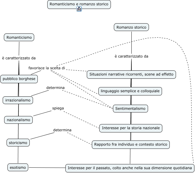 Questa Cmap, creata con IHMC CmapTools, contiene informazioni relative a: romanzo storico e romanticismo, Romanzo storico è caratterizzato da Interesse per la storia nazionale, Romanticismo è caratterizzato da storicismo, Romanzo storico è caratterizzato da Situazioni narrative ricorrenti, scene ad effetto, nazionalismo spiega Interesse per la storia nazionale, Romanzo storico è caratterizzato da Interesse per il passato, colto anche nella sua dimensione quotidiana, Romanzo storico è caratterizzato da Rapporto fra individuo e contesto storico, Romanticismo è caratterizzato da esotismo, Romanticismo è caratterizzato da irrazionalismo, Romanzo storico è caratterizzato da linguaggio semplice e colloquiale, irrazionalismo determina Sentimentalismo, Romanticismo è caratterizzato da nazionalismo, esotismo ???? Interesse per il passato, colto anche nella sua dimensione quotidiana, Situazioni narrative ricorrenti, scene ad effetto favorisce la scelta di pubblico borghese, Situazioni narrative ricorrenti, scene ad effetto favorisce la scelta di Interesse per il passato, colto anche nella sua dimensione quotidiana, storicismo determina Rapporto fra individuo e contesto storico, Romanzo storico è caratterizzato da Sentimentalismo, Romanticismo è caratterizzato da pubblico borghese, Situazioni narrative ricorrenti, scene ad effetto favorisce la scelta di Sentimentalismo, Situazioni narrative ricorrenti, scene ad effetto favorisce la scelta di linguaggio semplice e colloquiale