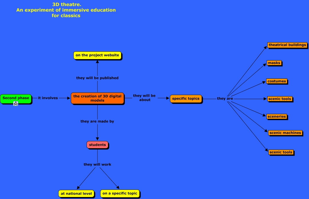 Second phase, specific topics they are masks, specific topics they are theatrical buildings, students they will work on a specific topic, specific topics they are costumes, the creation of 3D digital models they are made by students, the creation of 3D digital models they will be about specific topics, specific topics they are scenic machines, the creation of 3D digital models they will be published on the project website, specific topics they are scenic tools, specific topics they are sceneries