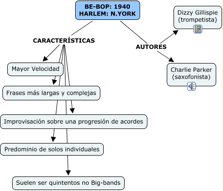 Este Cmap, tiene información relacionada con: Be_bop, BE-BOP: 1940 HARLEM: N.YORK CARACTERÍSTICAS Suelen ser quintentos no Big-bands, BE-BOP: 1940 HARLEM: N.YORK AUTORES Dizzy Gillispie (trompetista), BE-BOP: 1940 HARLEM: N.YORK CARACTERÍSTICAS Improvisación sobre una progresión de acordes, BE-BOP: 1940 HARLEM: N.YORK CARACTERÍSTICAS Predominio de solos individuales, BE-BOP: 1940 HARLEM: N.YORK AUTORES Charlie Parker (saxofonista), BE-BOP: 1940 HARLEM: N.YORK CARACTERÍSTICAS Mayor Velocidad, BE-BOP: 1940 HARLEM: N.YORK CARACTERÍSTICAS Frases más largas y complejas