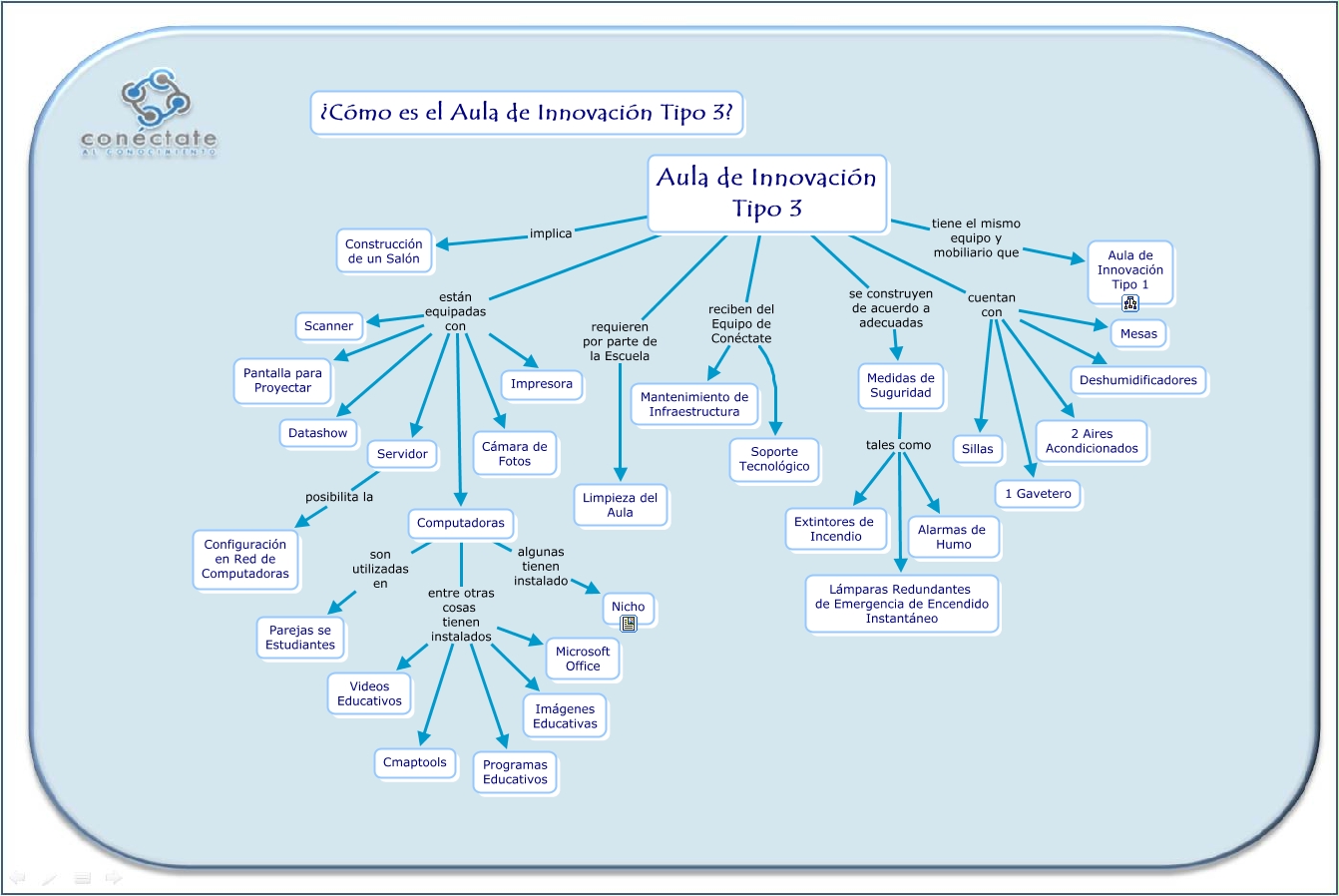 Este Cmap, tiene información relacionada con: Aula Tipo 2, Aula de Innovación Tipo 3 cuentan con Deshumidificadores, Computadoras entre otras cosas tienen instalados Imágenes Educativas, Computadoras entre otras cosas tienen instalados Microsoft Office, Computadoras entre otras cosas tienen instalados Videos Educativos, Computadoras algunas tienen instalado Nicho, Aula de Innovación Tipo 3 reciben del Equipo de Conéctate Soporte Tecnológico, Aula de Innovación Tipo 3 cuentan con 1 Gavetero, Aula de Innovación Tipo 3 cuentan con Mesas, Aula de Innovación Tipo 3 cuentan con Sillas, Aula de Innovación Tipo 3 implica Construcción de un Salón, Aula de Innovación Tipo 3 están equipadas con Servidor, Medidas de Suguridad tales como Lámparas Redundantes de Emergencia de Encendido Instantáneo, Aula de Innovación Tipo 3 están equipadas con Datashow, Aula de Innovación Tipo 3 se construyen de acuerdo a adecuadas Medidas de Suguridad, Medidas de Suguridad tales como Alarmas de Humo, Computadoras entre otras cosas tienen instalados Cmaptools, Aula de Innovación Tipo 3 tiene el mismo equipo y mobiliario que Aula de Innovación Tipo 1, Aula de Innovación Tipo 3 están equipadas con Computadoras, Servidor posibilita la Configuración en Red de Computadoras, Aula de Innovación Tipo 3 requieren por parte de la Escuela Limpieza del Aula