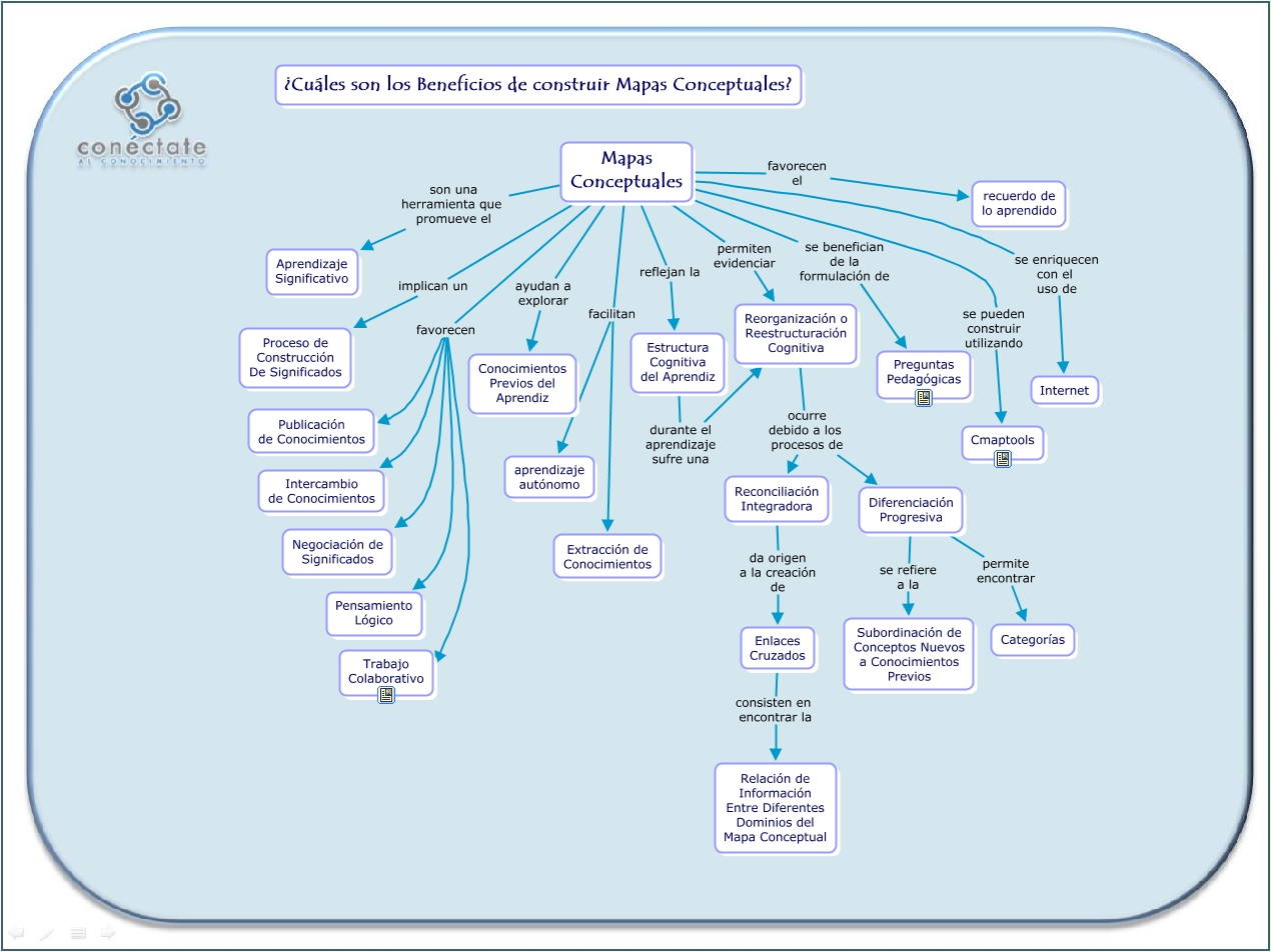 Este Cmap, tiene información relacionada con: Beneficios de la Construcción de Mapas Conceptuales, Mapas Conceptuales se pueden construir utilizando Cmaptools, Reconciliación Integradora da origen a la creación de Enlaces Cruzados, Estructura Cognitiva del Aprendiz durante el aprendizaje sufre una Reorganización o Reestructuración Cognitiva, Mapas Conceptuales favorecen Pensamiento Lógico, Mapas Conceptuales implican un Proceso de Construcción De Significados, Mapas Conceptuales se benefician de la formulación de Preguntas Pedagógicas, Mapas Conceptuales permiten evidenciar Reorganización o Reestructuración Cognitiva, Diferenciación Progresiva se refiere a la Subordinación de Conceptos Nuevos a Conocimientos Previos, Mapas Conceptuales son una herramienta que promueve el Aprendizaje Significativo, Mapas Conceptuales facilitan aprendizaje autónomo, Mapas Conceptuales reflejan la Estructura Cognitiva del Aprendiz, Reorganización o Reestructuración Cognitiva ocurre debido a los procesos de Reconciliación Integradora, Mapas Conceptuales ayudan a explorar Conocimientos Previos del Aprendiz, Diferenciación Progresiva permite encontrar Categorías, Mapas Conceptuales facilitan Extracción de Conocimientos, Mapas Conceptuales favorecen Intercambio de Conocimientos, Mapas Conceptuales favorecen Negociación de Significados, Reorganización o Reestructuración Cognitiva ocurre debido a los procesos de Diferenciación Progresiva, Mapas Conceptuales favorecen el recuerdo de lo aprendido, Mapas Conceptuales favorecen Publicación de Conocimientos