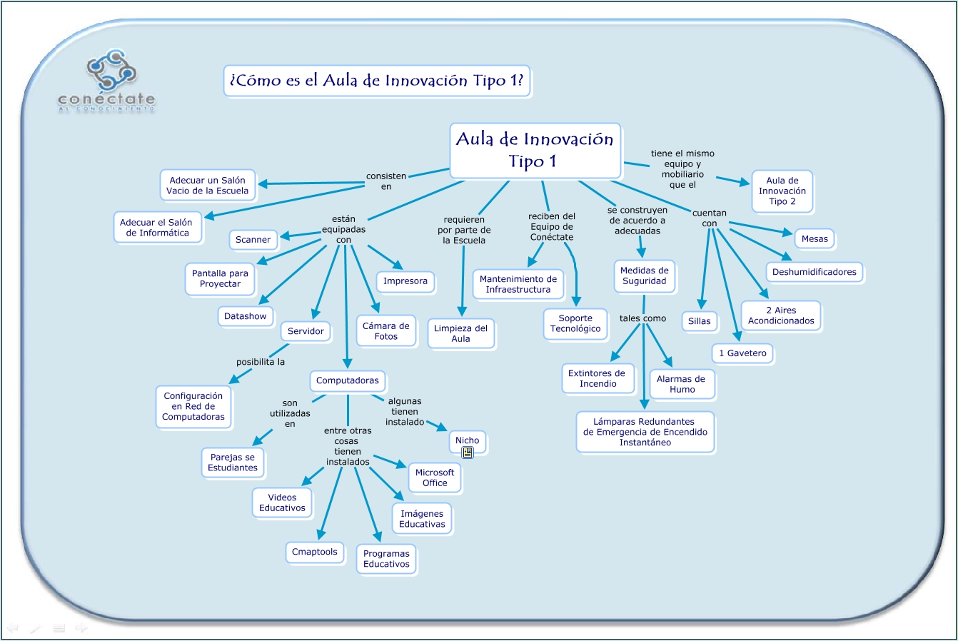 Este Cmap, tiene información relacionada con: Aula Tipo 1, Aula de Innovación Tipo 1 cuentan con Deshumidificadores, Computadoras entre otras cosas tienen instalados Imágenes Educativas, Aula de Innovación Tipo 1 consisten en Adecuar un Salón Vacio de la Escuela, Computadoras entre otras cosas tienen instalados Microsoft Office, Computadoras entre otras cosas tienen instalados Videos Educativos, Computadoras algunas tienen instalado Nicho, Aula de Innovación Tipo 1 tiene el mismo equipo y mobiliario que el Aula de Innovación Tipo 2, Aula de Innovación Tipo 1 reciben del Equipo de Conéctate Soporte Tecnológico, Aula de Innovación Tipo 1 consisten en Adecuar el Salón de Informática, Aula de Innovación Tipo 1 cuentan con 1 Gavetero, Aula de Innovación Tipo 1 cuentan con Mesas, Aula de Innovación Tipo 1 cuentan con Sillas, Aula de Innovación Tipo 1 están equipadas con Servidor, Medidas de Suguridad tales como Lámparas Redundantes de Emergencia de Encendido Instantáneo, Aula de Innovación Tipo 1 están equipadas con Datashow, Aula de Innovación Tipo 1 se construyen de acuerdo a adecuadas Medidas de Suguridad, Medidas de Suguridad tales como Alarmas de Humo, Computadoras entre otras cosas tienen instalados Cmaptools, Aula de Innovación Tipo 1 están equipadas con Computadoras, Servidor posibilita la Configuración en Red de Computadoras