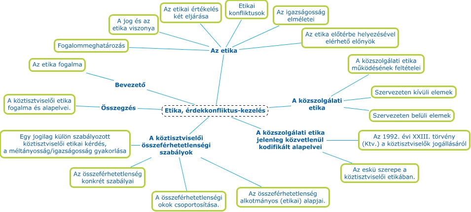 This Concept Map, created with IHMC CmapTools, has information related to: 5_1_etika_rdekkonfliktus-kezeles_kf, Etika, érdekkonfliktus-kezelés Az etika Az etika előtérbe helyezésével elérhető előnyök, Etika, érdekkonfliktus-kezelés A közszolgálati etika Szervezeten belüli elemek, Etika, érdekkonfliktus-kezelés A közszolgálati etika A közszolgálati etika működésének feltételei, Etika, érdekkonfliktus-kezelés A közszolgálati etika jelenleg közvetlenül kodifikált alapelvei Az 1992. évi XXIII. törvény (Ktv.) a köztisztviselők jogállásáról, Etika, érdekkonfliktus-kezelés Az etika Fogalommeghatározás, Etika, érdekkonfliktus-kezelés Az etika Az igazságosság elméletei, Etika, érdekkonfliktus-kezelés A köztisztviselői összeférhetetlenségi szabályok Az összeférhetetlenség konkrét szabályai, Etika, érdekkonfliktus-kezelés Az etika A jog és az etika viszonya, Etika, érdekkonfliktus-kezelés A köztisztviselői összeférhetetlenségi szabályok A összeférhetetlenségi okok csoportosítása., Etika, érdekkonfliktus-kezelés A közszolgálati etika jelenleg közvetlenül kodifikált alapelvei Az eskü szerepe a köztisztviselői etikában., Etika, érdekkonfliktus-kezelés A köztisztviselői összeférhetetlenségi szabályok Egy jogilag külön szabályozott köztisztviselői etikai kérdés, a méltányosság/igazságosság gyakorlása, Etika, érdekkonfliktus-kezelés A köztisztviselői összeférhetetlenségi szabályok Az összeférhetetlenség alkotmányos (etikai) alapjai., Etika, érdekkonfliktus-kezelés Bevezető Az etika fogalma, Etika, érdekkonfliktus-kezelés Az etika Etikai konfliktusok, Etika, érdekkonfliktus-kezelés Összegzés A köztisztviselői etika fogalma és alapelvei., Etika, érdekkonfliktus-kezelés A közszolgálati etika Szervezeten kívüli elemek, Etika, érdekkonfliktus-kezelés Az etika Az etikai értékelés két eljárása