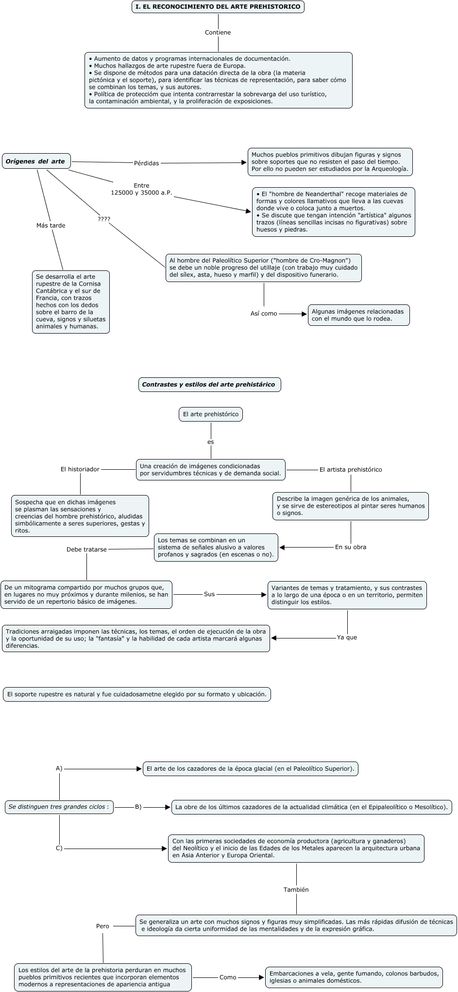 This Concept Map, created with IHMC CmapTools, has information related to: elReconocimientoDelArtePrehistorico, Orígenes del arte ???? Al hombre del Paleolítico Superior ("hombre de Cro-Magnon") se debe un noble progreso del utillaje (con trabajo muy cuidado del sílex, asta, hueso y marfil) y del dispositivo funerario., Con las primeras sociedades de economía productora (agricultura y ganaderos) del Neolítico y el inicio de las Edades de los Metales aparecen la arquitectura urbana en Asia Anterior y Europa Oriental. También Se generaliza un arte con muchos signos y figuras muy simplificadas. Las más rápidas difusión de técnicas e ideología da cierta uniformidad de las mentalidades y de la expresión gráfica., Una creación de imágenes condicionadas por servidumbres técnicas y de demanda social. El artista prehistórico Describe la imagen genérica de los animales, y se sirve de estereotipos al pintar seres humanos o signos., Orígenes del arte Pérdidas Muchos pueblos primitivos dibujan figuras y signos sobre soportes que no resisten el paso del tiempo. Por ello no pueden ser estudiados por la Arqueología., Se distinguen tres grandes ciclos: C) Con las primeras sociedades de economía productora (agricultura y ganaderos) del Neolítico y el inicio de las Edades de los Metales aparecen la arquitectura urbana en Asia Anterior y Europa Oriental., I. EL RECONOCIMIENTO DEL ARTE PREHISTORICO Contiene • Aumento de datos y programas internacionales de documentación. • Muchos hallazgos de arte rupestre fuera de Europa. • Se dispone de métodos para una datación directa de la obra (la materia pictónica y el soporte), para identificar las técnicas de representación, para saber cómo se combinan los temas, y sus autores. • Política de proteccióm que intenta contrarrestar la sobrevarga del uso turístico, la contaminación ambiental, y la proliferación de exposiciones., Al hombre del Paleolítico Superior ("hombre de Cro-Magnon") se debe un noble progreso del utillaje (con trabajo muy cuidado del sílex, asta, hueso y marfil) y del dispositivo funerario. Así como Algunas imágenes relacionadas con el mundo que lo rodea., Orígenes del arte Más tarde Se desarrolla el arte rupestre de la Cornisa Cantábrica y el sur de Francia, con trazos hechos con los dedos sobre el barro de la cueva, signos y siluetas animales y humanas., Los temas se combinan en un sistema de señales alusivo a valores profanos y sagrados (en escenas o no). Debe tratarse De un mitograma compartido por muchos grupos que, en lugares no muy próximos y durante milenios, se han servido de un repertorio básico de imágenes., Se generaliza un arte con muchos signos y figuras muy simplificadas. Las más rápidas difusión de técnicas e ideología da cierta uniformidad de las mentalidades y de la expresión gráfica. Pero Los estilos del arte de la prehistoria perduran en muchos pueblos primitivos recientes que incorporan elementos modernos a representaciones de apariencia antigua, Los estilos del arte de la prehistoria perduran en muchos pueblos primitivos recientes que incorporan elementos modernos a representaciones de apariencia antigua Como Embarcaciones a vela, gente fumando, colonos barbudos, iglesias o animales domésticos., Se distinguen tres grandes ciclos: B) La obre de los últimos cazadores de la actualidad climática (en el Epipaleolítico o Mesolítico)., El arte prehistórico es Una creación de imágenes condicionadas por servidumbres técnicas y de demanda social., Variantes de temas y tratamiento, y sus contrastes a lo largo de una época o en un territorio, permiten distinguir los estilos. Ya que Tradiciones arraigadas imponen las técnicas, los temas, el orden de ejecución de la obra y la oportunidad de su uso; la "fantasía" y la habilidad de cada artista marcará algunas diferencias., Describe la imagen genérica de los animales, y se sirve de estereotipos al pintar seres humanos o signos. En su obra Los temas se combinan en un sistema de señales alusivo a valores profanos y sagrados (en escenas o no)., Se distinguen tres grandes ciclos: A) El arte de los cazadores de la época glacial (en el Paleolítico Superior)., Una creación de imágenes condicionadas por servidumbres técnicas y de demanda social. El historiador Sospecha que en dichas imágenes se plasman las sensaciones y creencias del hombre prehistórico, aludidas simbólicamente a seres superiores, gestas y ritos., Orígenes del arte Entre 125000 y 35000 a.P. • El "hombre de Neanderthal" recoge materiales de formas y colores llamativos que lleva a las cuevas donde vive o coloca junto a muertos. • Se discute que tengan intención "artística" algunos trazos (líneas sencillas incisas no figurativas) sobre huesos y piedras., De un mitograma compartido por muchos grupos que, en lugares no muy próximos y durante milenios, se han servido de un repertorio básico de imágenes. Sus Variantes de temas y tratamiento, y sus contrastes a lo largo de una época o en un territorio, permiten distinguir los estilos.
