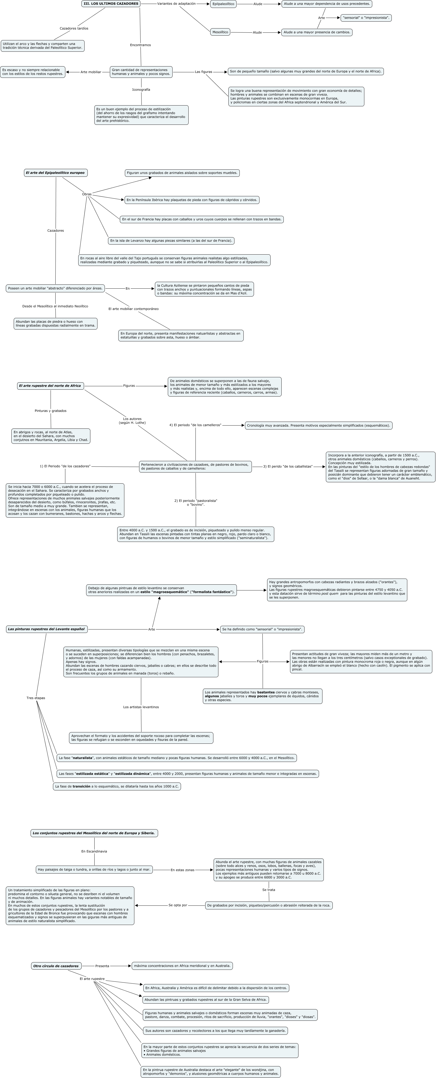 This Concept Map, created with IHMC CmapTools, has information related to: losUltimosCazadores, Hay paisajes de taiga o tundra, a orillas de ríos y lagos o junto al mar. En estas zonas Abunda el arte rupestre, con muchas figuras de animales cazables (sobre todo alces y renos, osos, lobos, ballenas, focas y aves), pocas representaciones humanas y varios tipos de signos. Los ejemplos más antiguos pueden retomarse a 7000 u 8000 a.C. y su apogeo se produce entre 6000 y 3000 a.C., III. LOS ULTIMOS CAZADORES Variantes de adaptación Mesolítico, Mesolítico Alude Alude a una mayor presencia de cambios., III. LOS ULTIMOS CAZADORES Encontramos Gran cantidad de representaciones humanas y animales y pocos signos., Las pinturas rupestres del Levante español Tres etapas La fase "naturalista", con animales estáticos de tamaño mediano y pocas figuras humanas. Se desarrolló entre 6000 y 4000 a.C., en el Mesolítico., Otro círculo de cazadores El arte rupestre En la pintrua rupestre de Australia destaca el arte "elegante" de los wondjina, con atropomorfos y "demonios", y alusiones geométricas a cuerpos humanos y animales., Se ha definido como "sensorial" o "impresionista". Figuras Los animales representados hay bastantes ciervos y cabras monteses, algunos jabalíes y toros y muy pocos ejemplares de équidos, cánidos y otras especies., Poseen un arte mobiliar "abstracto" diferenciado por áreas. Desde el Mesolítico al inmediato Neolítico Abundan las placas de piedra o hueso con líneas grabadas dispuestas radialmente en trama., El arte del Epipaleolítico europeo Obras En el sur de Francia hay placas con caballos y uros cuyos cuerpos se rellenan con trazos en bandas., El arte rupestre del norte de Africa Los autores (según H. Lothe) Pertenecieron a civilizaciones de cazadoes, de pastores de bovinos, de pastores de caballos y de camelleros:, Gran cantidad de representaciones humanas y animales y pocos signos. Las figuras Son de pequeño tamaño (salvo algunas muy grandes del norte de Europa y el norte de Africa)., Poseen un arte mobiliar "abstracto" diferenciado por áreas. En la Cultura Aziliense se pintaron pequeños cantos de pieda con trazos anchos y puntuacionales formando líneas, aspas o bandas: su máxima concentración se da en Mas d'Azil., Pertenecieron a civilizaciones de cazadoes, de pastores de bovinos, de pastores de caballos y de camelleros: 4) El periodo "de los camelleros" Cronología muy avanzada. Presenta motivos especialmente simplificados (esquemáticos)., Pertenecieron a civilizaciones de cazadoes, de pastores de bovinos, de pastores de caballos y de camelleros: 3) El perido "de los caballistas" Incorpora a la anterior iconografía, a partir de 1500 a.C., otros animales domésticos (caballos, carneros y perros). Concepción muy estilizada. En las pinturas del "estilo de los hombres de cabezas redondas" del Tassili se representan figuras adornadas de gran tamaño y posicián dominante que debieron tener un carácter emblemático, como el "dios" de Sefaar, o la "dama blanca" de Auaneht., Otro círculo de cazadores Presenta máxima concentraciones en Africa meridional y en Australia., El arte del Epipaleolítico europeo Obras En la Península Ibérica hay plaquetas de pieda con figuras de cápridos y cérvidos., Pertenecieron a civilizaciones de cazadoes, de pastores de bovinos, de pastores de caballos y de camelleros: 2) El periodo "pastoralista" o "bovino". Entre 4000 a.C. y 1500 a.C., el grabado es de incisión, piqueteado y pulido menso regular. Abundan en Tassili las escenas pintadas con tintas planas en negro, rojo, pardo claro o blanco, con figuras de humanos o bovinos de menor tamaño y estilo simplificado ("seminaturalista")., Alude a una mayor dependencia de usos precedentes. Arte Alude a una mayor presencia de cambios., Gran cantidad de representaciones humanas y animales y pocos signos. Las figuras Se logra una buena representación de movimiento con gran economía de detalles; hombres y animales se combinan en escenas de gran viveza. Las pinturas rupestres son exclusivamente monocormas en Europa, y policromas en ciertas zonas del Africa septendrional y América del Sur., Epilpaleolítico Alude Alude a una mayor dependencia de usos precedentes.