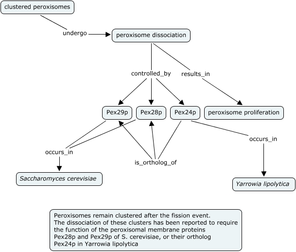 This Concept Map, created with IHMC CmapTools, has information related to: peroxisome dissociation, peroxisome dissociation controlled_by Pex29p, Pex29p occurs_in Saccharomyces cerevisiae, Pex24p is_ortholog_of Pex29p, clustered peroxisomes undergo peroxisome dissociation, Pex24p occurs_in Yarrowia lipolytica, peroxisome dissociation results_in peroxisome proliferation, peroxisome dissociation controlled_by Pex24p, peroxisome dissociation controlled_by Pex28p, Pex28p occurs_in Saccharomyces cerevisiae, Pex24p is_ortholog_of Pex28p