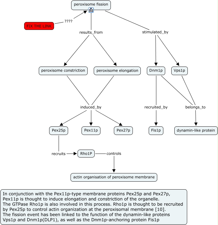 This Concept Map, created with IHMC CmapTools, has information related to: Peroxisome fission_02, Dnm1p recruited_by Fis1p, peroxisome elongation induced_by Pex11p, peroxisome elongation induced_by Pex27p, peroxisome fission stimulated_by Dnm1p, Vps1p belongs_to dynamin-like protein, Dnm1p belongs_to dynamin-like protein, FIX THE LINK ???? peroxisome fission, peroxisome constriction induced_by Pex27p, peroxisome fission stimulated_by Vps1p, Pex25p recruits Rho1P, peroxisome elongation induced_by Pex25p, peroxisome constriction induced_by Pex11p, Rho1P controls actin organisation of peroxisome membrane, peroxisome constriction induced_by Pex25p, peroxisome fission results_from peroxisome constriction, peroxisome fission results_from peroxisome elongation
