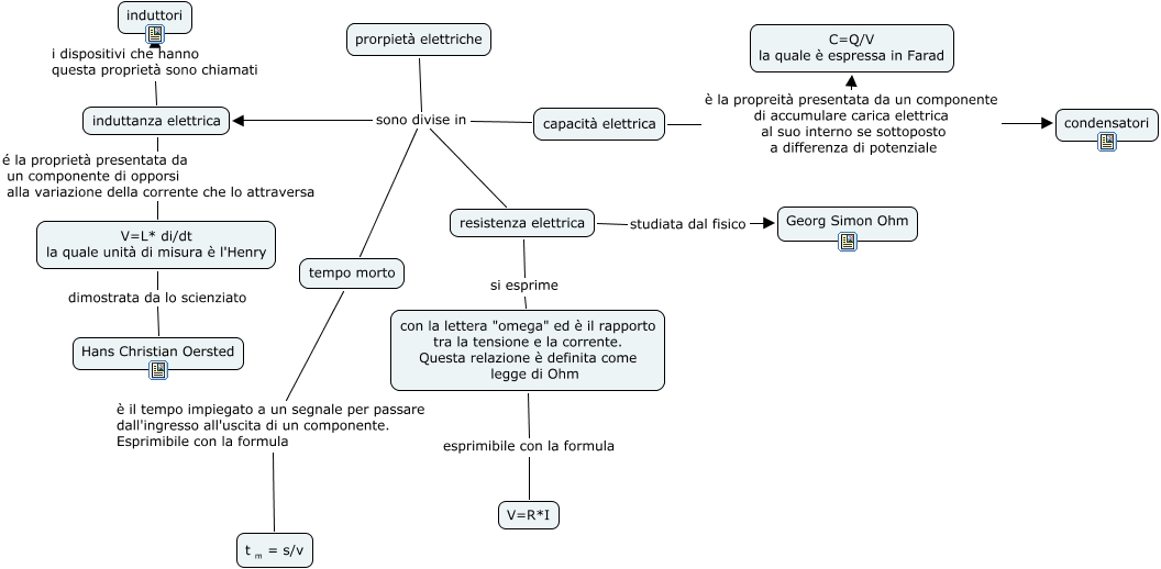 Questa Cmap, creata con IHMC CmapTools, contiene informazioni relative a: Le proprietà elettriche, capacità elettrica sono divise in resistenza elettrica, capacità elettrica è la propreità presentata da un componente di accumulare carica elettrica al suo interno se sottoposto a differenza di potenziale C=Q/V la quale è espressa in Farad, resistenza elettrica studiata dal fisico Georg Simon Ohm, V=L* di/dt la quale unità di misura è l'Henry dimostrata da lo scienziato Hans Christian Oersted, resistenza elettrica si esprime con la lettera "omega" ed è il rapporto tra la tensione e la corrente. Questa relazione è definita come legge di Ohm, con la lettera "omega" ed è il rapporto tra la tensione e la corrente. Questa relazione è definita come legge di Ohm esprimibile con la formula V=R*I, prorpietà elettriche sono divise in induttanza elettrica, prorpietà elettriche sono divise in tempo morto, induttanza elettrica i dispositivi che hanno questa proprietà sono chiamati induttori, capacità elettrica sono divise in tempo morto, capacità elettrica è la propreità presentata da un componente di accumulare carica elettrica al suo interno se sottoposto a differenza di potenziale condensatori, prorpietà elettriche sono divise in resistenza elettrica, capacità elettrica sono divise in induttanza elettrica, tempo morto è il tempo impiegato a un segnale per passare dall'ingresso all'uscita di un componente. Esprimibile con la formula <math xmlns="http://www.w3.org/1998/Math/MathML"> <mrow> <mtext> t </mtext> <mmultiscripts> <mtext> </mtext> <mtext> m </mtext> <none/> </mmultiscripts> <mtext> = s/v </mtext> </mrow> </math>, induttanza elettrica é la proprietà presentata da un componente di opporsi alla variazione della corrente che lo attraversa V=L* di/dt la quale unità di misura è l'Henry