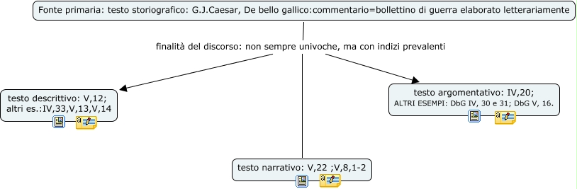 Questa Mappa Concettuale ha informazioni correlate a: testo storiografico, Fonte primaria: testo storiografico: G.J.Caesar, De bello gallico:commentario=bollettino di guerra elaborato letterariamente finalità del discorso: non sempre univoche, ma con indizi prevalenti testo narrativo: V,22 ;V,8,1-2, Fonte primaria: testo storiografico: G.J.Caesar, De bello gallico:commentario=bollettino di guerra elaborato letterariamente finalità del discorso: non sempre univoche, ma con indizi prevalenti testo descrittivo: V,12; altri es.:IV,33,V,13,V,14, Fonte primaria: testo storiografico: G.J.Caesar, De bello gallico:commentario=bollettino di guerra elaborato letterariamente finalità del discorso: non sempre univoche, ma con indizi prevalenti testo argomentativo: IV,20; ALTRI ESEMPI: DbG IV, 30 e 31; DbG V, 16.
