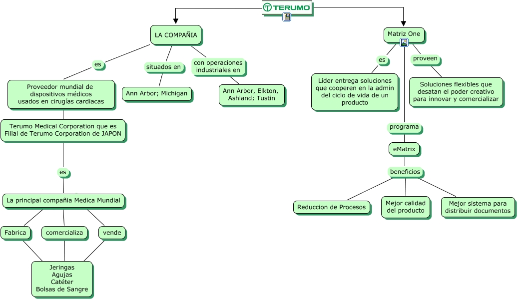 Este Cmap, tiene información relacionada con: Terumo, LA COMPAÑIA con operaciones industriales en Ann Arbor, Elkton, Ashland; Tustin, LA COMPAÑIA situados en Ann Arbor; Michigan, La principal compañia Medica Mundial vende, ???? LA COMPAÑIA, Proveedor mundial de dispositivos médicos usados en cirugías cardiacas ???? Terumo Medical Corporation que es Filial de Terumo Corporation de JAPON, La principal compañia Medica Mundial Fabrica, Matriz One proveen Soluciones flexibles que desatan el poder creativo para innovar y comercializar, Matriz One programa eMatrix, eMatrix beneficios Mejor calidad del producto, comercializa Jeringas Agujas Catéter Bolsas de Sangre, Terumo Medical Corporation que es Filial de Terumo Corporation de JAPON es La principal compañia Medica Mundial, Matriz One es Líder entrega soluciones que cooperen en la admin del ciclo de vida de un producto, Matriz One, vende Jeringas Agujas Catéter Bolsas de Sangre, Fabrica Jeringas Agujas Catéter Bolsas de Sangre, LA COMPAÑIA es Proveedor mundial de dispositivos médicos usados en cirugías cardiacas, eMatrix beneficios Mejor sistema para distribuir documentos, eMatrix beneficios Reduccion de Procesos, La principal compañia Medica Mundial comercializa