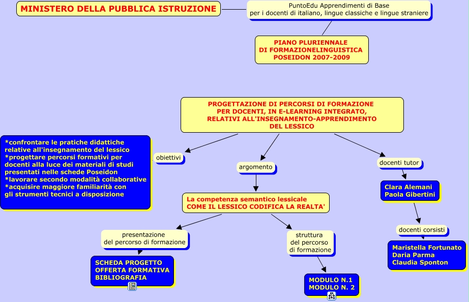 Questa Cmap, creata con IHMC CmapTools, contiene informazioni relative a: copertina, PROGETTAZIONE DI PERCORSI DI FORMAZIONE PER DOCENTI, IN E-LEARNING INTEGRATO, RELATIVI ALL'INSEGNAMENTO-APPRENDIMENTO DEL LESSICO obiettivi *confrontare le pratiche didattiche relative all'insegnamento del lessico *progettare percorsi formativi per docenti alla luce dei materiali di studi presentati nelle schede Poseidon *lavorare secondo modalità collaborative *acquisire maggiore familiarità con gli strumenti tecnici a disposizione, PROGETTAZIONE DI PERCORSI DI FORMAZIONE PER DOCENTI, IN E-LEARNING INTEGRATO, RELATIVI ALL'INSEGNAMENTO-APPRENDIMENTO DEL LESSICO docenti tutor Clara Alemani Paola Gibertini, PROGETTAZIONE DI PERCORSI DI FORMAZIONE PER DOCENTI, IN E-LEARNING INTEGRATO, RELATIVI ALL'INSEGNAMENTO-APPRENDIMENTO DEL LESSICO argomento La competenza semantico lessicale COME IL LESSICO CODIFICA LA REALTA', La competenza semantico lessicale COME IL LESSICO CODIFICA LA REALTA' presentazione del percorso di formazione SCHEDA PROGETTO OFFERTA FORMATIVA BIBLIOGRAFIA, La competenza semantico lessicale COME IL LESSICO CODIFICA LA REALTA' struttura del percorso di formazione MODULO N.1 MODULO N. 2, MINISTERO DELLA PUBBLICA ISTRUZIONE PuntoEdu Apprendimenti di Base per i docenti di italiano, lingue classiche e lingue straniere PIANO PLURIENNALE DI FORMAZIONELINGUISTICA POSEIDON 2007-2009, Clara Alemani Paola Gibertini docenti corsisti Maristella Fortunato Daria Parma Claudia Sponton