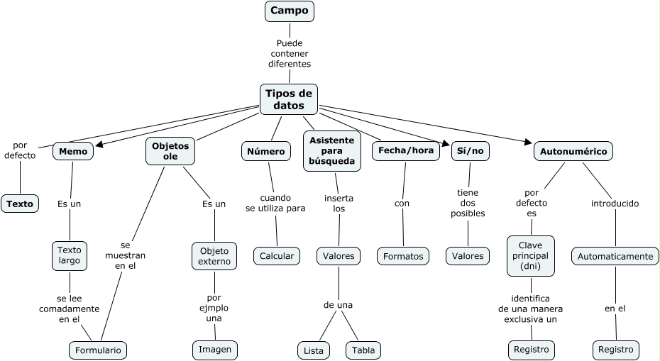 Este Cmap, tiene información relacionada con: Tipos de datos, Tipos de datos Objetos ole, Tipos de datos Memo, Tipos de datos Sí/no, Tipos de datos Número, Objetos ole se muestran en el Formulario, Texto largo se lee comadamente en el Formulario, Tipos de datos Asistente para búsqueda, Tipos de datos Fecha/hora, Fecha/hora con Formatos, Autonumérico introducido Automaticamente, Sí/no tiene dos posibles Valores, Autonumérico por defecto es Clave principal (dni), Tipos de datos Autonumérico, Objetos ole Es un Objeto externo, Asistente para búsqueda inserta los Valores, Clave principal (dni) identifica de una manera exclusiva un Registro, Valores de una Lista, Memo Es un Texto largo, Automaticamente en el Registro, Número cuando se utiliza para Calcular