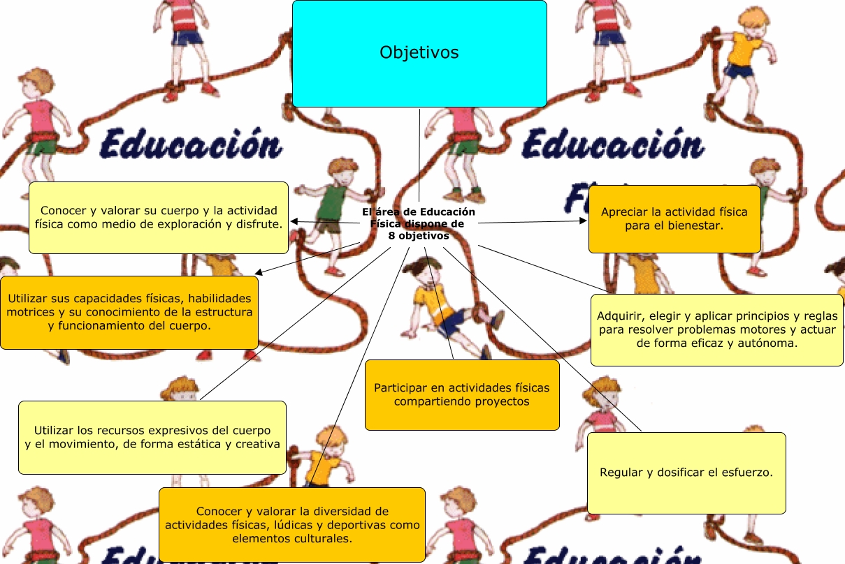 Este Cmap, tiene información relacionada con: Objetivos, Objetivos El área de Educación Física dispone de 8 objetivos Utilizar sus capacidades físicas, habilidades motrices y su conocimiento de la estructura y funcionamiento del cuerpo., Objetivos El área de Educación Física dispone de 8 objetivos Regular y dosificar el esfuerzo., Objetivos El área de Educación Física dispone de 8 objetivos Adquirir, elegir y aplicar principios y reglas para resolver problemas motores y actuar de forma eficaz y autónoma., Objetivos El área de Educación Física dispone de 8 objetivos Utilizar los recursos expresivos del cuerpo y el movimiento, de forma estática y creativa, Objetivos El área de Educación Física dispone de 8 objetivos Participar en actividades físicas compartiendo proyectos, Objetivos El área de Educación Física dispone de 8 objetivos Apreciar la actividad física para el bienestar., Objetivos El área de Educación Física dispone de 8 objetivos Conocer y valorar su cuerpo y la actividad física como medio de exploración y disfrute., Objetivos El área de Educación Física dispone de 8 objetivos Conocer y valorar la diversidad de actividades físicas, lúdicas y deportivas como elementos culturales.