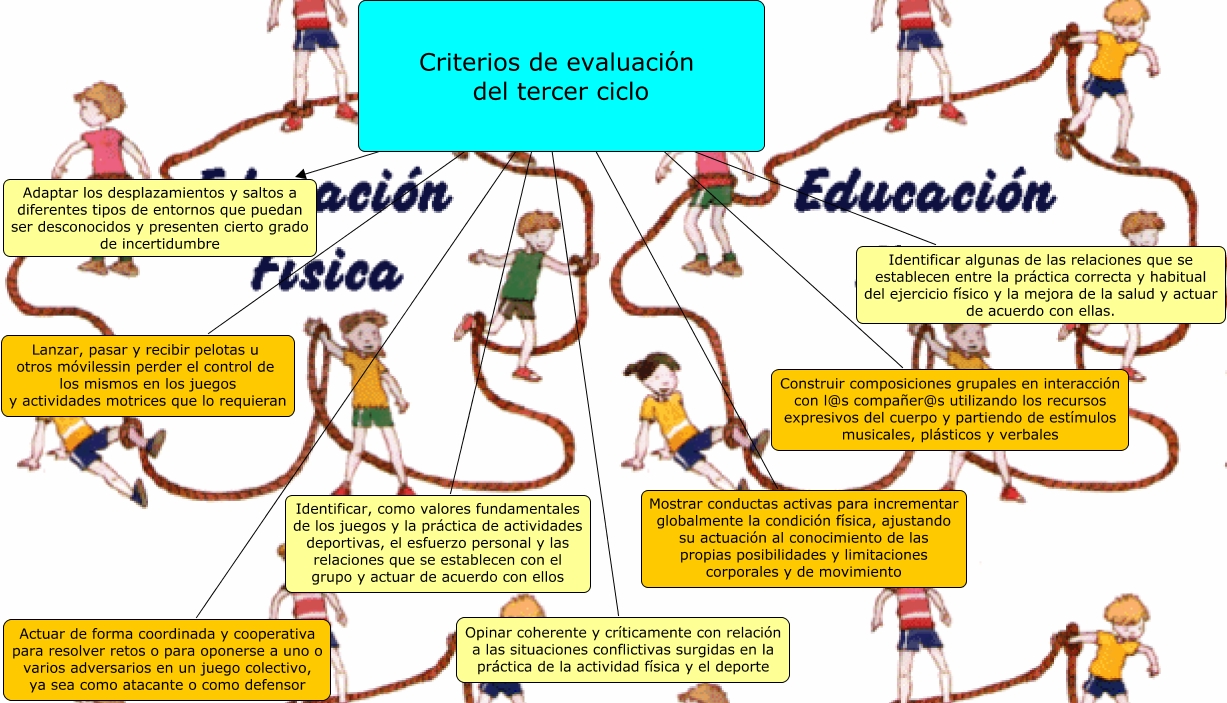 Este Cmap, tiene información relacionada con: Criterios evaluación 3º ciclo, Criterios de evaluación del tercer ciclo ???? Lanzar, pasar y recibir pelotas u otros móvilessin perder el control de los mismos en los juegos y actividades motrices que lo requieran, Criterios de evaluación del tercer ciclo ???? Adaptar los desplazamientos y saltos a diferentes tipos de entornos que puedan ser desconocidos y presenten cierto grado de incertidumbre, Criterios de evaluación del tercer ciclo ???? Opinar coherente y críticamente con relación a las situaciones conflictivas surgidas en la práctica de la actividad física y el deporte, Criterios de evaluación del tercer ciclo ???? Identificar algunas de las relaciones que se establecen entre la práctica correcta y habitual del ejercicio físico y la mejora de la salud y actuar de acuerdo con ellas., Criterios de evaluación del tercer ciclo ???? Mostrar conductas activas para incrementar globalmente la condición física, ajustando su actuación al conocimiento de las propias posibilidades y limitaciones corporales y de movimiento, Criterios de evaluación del tercer ciclo ???? Identificar, como valores fundamentales de los juegos y la práctica de actividades deportivas, el esfuerzo personal y las relaciones que se establecen con el grupo y actuar de acuerdo con ellos, Criterios de evaluación del tercer ciclo ???? Construir composiciones grupales en interacción con l@s compañer@s utilizando los recursos expresivos del cuerpo y partiendo de estímulos musicales, plásticos y verbales, Criterios de evaluación del tercer ciclo ???? Actuar de forma coordinada y cooperativa para resolver retos o para oponerse a uno o varios adversarios en un juego colectivo, ya sea como atacante o como defensor