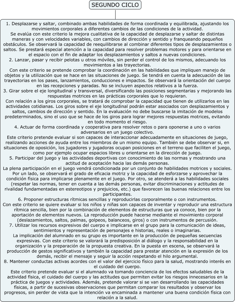 Este Cmap, tiene información relacionada con: Sin Título 32, SEGUNDO CICLO ???? 1. Desplazarse y saltar, combinado ambas habilidades de forma coordinada y equilibrada, ajustando los movimientos corporales a diferentes cambios de las condiciones de la actividad. Se evalúa con este criterio la mejora cualitativa de la capacidad de desplazarse y saltar de distintas maneras y con velocidades variables, con cambios de dirección y sentido y franqueando pequeños obstáculos. Se observará la capacidad de reequilibrarse al combinar diferentes tipos de desplazamientos o saltos. Se prestará especial atención a la capacidad para resolver problemas motores y para orientarse en el espacio con el fin de adaptar los desplazamientos y saltos a nuevas condiciones. 2. Lanzar, pasar y recibir pelotas u otros móviles, sin perder el control de los mismos, adecuando los movimientos a las trayectorias. Con este criterio se pretende comprobar la coordinación en las habilidades que impliquen manejo de objetos y la utilización que se hace en las situaciones de juego. Se tendrá en cuenta la adecuación de las trayectorias en los pases, lanzamientos, conducciones e impactos. Se observará la orientación del cuerpo en las recepciones y paradas. No se incluyen aspectos relativos a la fuerza. 3. Girar sobre el eje longitudinal y transversal, diversificando las posiciones segmentarias y mejorando las respuestas motrices en las prácticas corporales que lo requieran. Con relación a los giros corporales, se tratará de comprobar la capacidad que tienen de utilizarlos en las actividades cotidianas. Los giros sobre el eje longitudinal podrán estar asociados con desplazamientos y saltos, cambios de dirección y sentido. En la evaluación no debe buscarse la imitación de modelos predeterminados, sino el uso que se hace de los giros para lograr mejores respuestas motrices, evitando en todo momento el riesgo. 4. Actuar de forma coordinada y cooperativa para resolver retos o para oponerse a uno o varios adversarios en un juego colectivo. Este criterio pretende evaluar si son capaces de interaccionar adecuadamente en situaciones de juego, realizando acciones de ayuda entre los miembros de un mismo equipo. También se debe observar si, en situaciones de oposición, los jugadores y jugadoras ocupan posiciones en el terreno que faciliten el juego, como por ejemplo ocupar espacios libres u orientarse en la dirección de juego. 5. Participar del juego y las actividades deportivas con conocimiento de las normas y mostrando una actitud de aceptación hacia las demás personas. La plena participación en el juego vendrá condicionada por un conjunto de habilidades motrices y sociales. Por un lado, se observará el grado de eficacia motriz y la capacidad de esforzarse y aprovechar la condición física para implicarse plenamente en el juego. Por otro, se atenderá a las habilidades sociales (respetar las normas, tener en cuenta a las demás personas, evitar discriminaciones y actitudes de rivalidad fundamentadas en estereotipos y prejuicios, etc.) que favorecen las buenas relaciones entre los participantes. 6. Proponer estructuras rítmicas sencillas y reproducirlas corporalmente o con instrumentos. Con este criterio se quiere evaluar si los niños y niñas son capaces de inventar y reproducir una estructura rítmica sencilla, bien por la combinación de elementos de estructuras que ya conoce, bien por la aportación de elementos nuevos. La reproducción puede hacerse mediante el movimiento corporal (deslazamientos, saltos, palmas, golpeos, balanceos, giros) o con instrumentos de percusión. 7. Utilizar los recursos expresivos del cuerpo e implicarse en el grupo para la comunicación de ideas, sentimientos y representación de personajes e historias, reales o imaginarias. La implicación del alumnado en su grupo es importante en la producción de pequeñas secuencias expresivas. Con este criterio se valorará la predisposición al diálogo y la responsabilidad en la organización y la preparación de la propuesta creativa. En la puesta en escena, se observará la producción de gestos significativos y también la capacidad para prestar atención en la expresión de los demás, recibir el mensaje y seguir la acción respetando el hilo argumental. 8. Mantener conductas activas acordes con el valor del ejercicio físico para la salud, mostrando interés en el cuidado del cuerpo. Este criterio pretende evaluar si el alumnado va tomando conciencia de los efectos saludables de la actividad física, el cuidado del cuerpo y las actitudes que permiten evitar los riesgos innecesarios en la práctica de juegos y actividades. Además, pretende valorar si se van desarrollando las capacidades físicas, a partir de sucesivas observaciones que permitan comparar los resultados y observar los progresos, sin perder de vista que la intención va encaminada a mantener una buena condición física con relación a la salud.