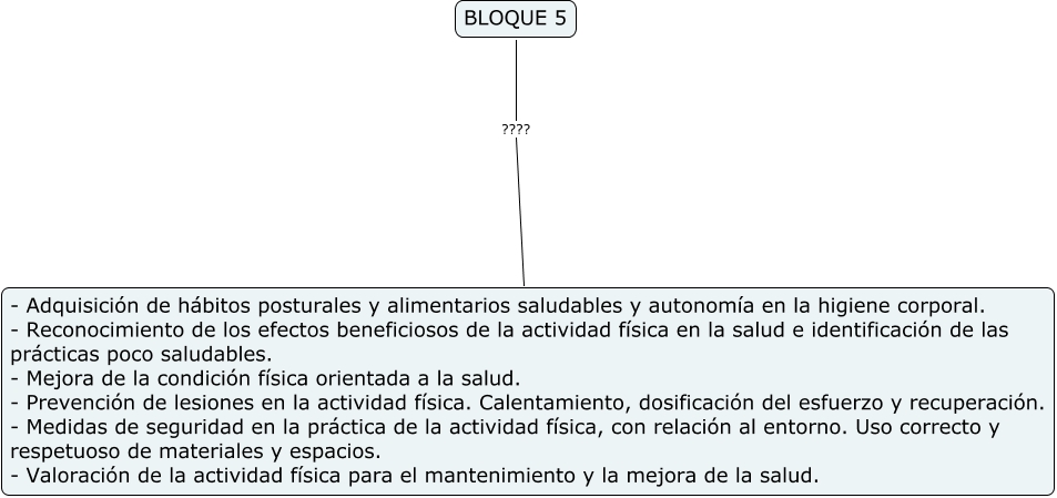Este Cmap, tiene información relacionada con: Sin Título 30, BLOQUE 5 ???? - Adquisición de hábitos posturales y alimentarios saludables y autonomía en la higiene corporal. - Reconocimiento de los efectos beneficiosos de la actividad física en la salud e identificación de las prácticas poco saludables. - Mejora de la condición física orientada a la salud. - Prevención de lesiones en la actividad física. Calentamiento, dosificación del esfuerzo y recuperación. - Medidas de seguridad en la práctica de la actividad física, con relación al entorno. Uso correcto y respetuoso de materiales y espacios. - Valoración de la actividad física para el mantenimiento y la mejora de la salud.