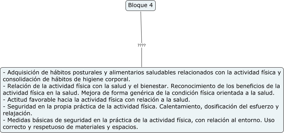 Este Cmap, tiene información relacionada con: Sin Título 16, Bloque 4 ???? - Adquisición de hábitos posturales y alimentarios saludables relacionados con la actividad física y consolidación de hábitos de higiene corporal. - Relación de la actividad física con la salud y el bienestar. Reconocimiento de los beneficios de la actividad física en la salud. Mejora de forma genérica de la condición física orientada a la salud. - Actitud favorable hacia la actividad física con relación a la salud. - Seguridad en la propia práctica de la actividad física. Calentamiento, dosificación del esfuerzo y relajación. - Medidas básicas de seguridad en la práctica de la actividad física, con relación al entorno. Uso correcto y respetuoso de materiales y espacios.