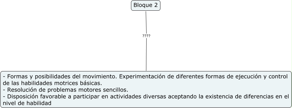 Este Cmap, tiene información relacionada con: Sin Título 14, Bloque 2 ???? - Formas y posibilidades del movimiento. Experimentación de diferentes formas de ejecución y control de las habilidades motrices básicas. - Resolución de problemas motores sencillos. - Disposición favorable a participar en actividades diversas aceptando la existencia de diferencias en el nivel de habilidad