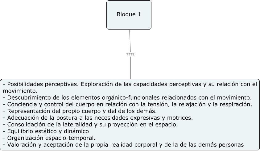 Este Cmap, tiene información relacionada con: Sin Título 18, Bloque 1 ???? - Posibilidades perceptivas. Exploración de las capacidades perceptivas y su relación con el movimiento. - Descubrimiento de los elementos orgánico-funcionales relacionados con el movimiento. - Conciencia y control del cuerpo en relación con la tensión, la relajación y la respiración. - Representación del propio cuerpo y del de los demás. - Adecuación de la postura a las necesidades expresivas y motrices. - Consolidación de la lateralidad y su proyección en el espacio. - Equilibrio estático y dinámico - Organización espacio-temporal. - Valoración y aceptación de la propia realidad corporal y de la de las demás personas