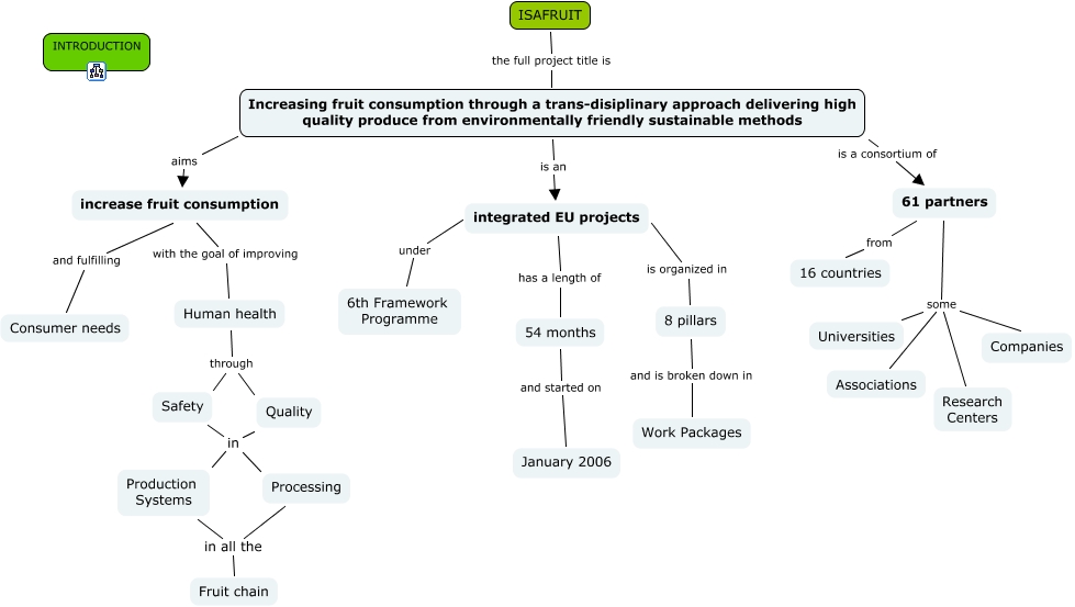 briefly explanation of ISAFRUIT project, increase fruit consumption with the goal of improving Human health, Human health through Quality, 61 partners some Associations, Increasing fruit consumption through a trans-disiplinary approach delivering high quality produce from environmentally friendly sustainable methods aims increase fruit consumption, Quality in Processing, 61 partners some Universities, Human health through Safety, integrated EU projects is organized in 8 pillars, Safety in Production Systems, Increasing fruit consumption through a trans-disiplinary approach delivering high quality produce from environmentally friendly sustainable methods is an integrated EU projects