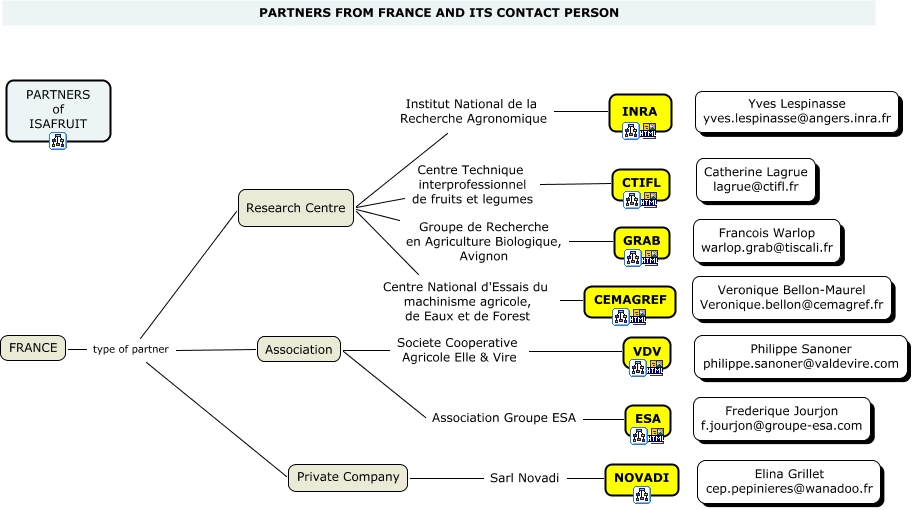 France, FRANCE type of partner Association, Private Company Sarl Novadi NOVADI, Association Association Groupe ESA ESA, Research Centre Groupe de Recherche en Agriculture Biologique, Avignon GRAB, Association Societe Cooperative Agricole Elle & Vire VDV, Research Centre Institut National de la Recherche Agronomique INRA, Research Centre Centre Technique interprofessionnel de fruits et legumes CTIFL, Research Centre Centre National d'Essais du machinisme agricole, de Eaux et de Forest CEMAGREF, FRANCE type of partner Private Company, FRANCE type of partner Research Centre