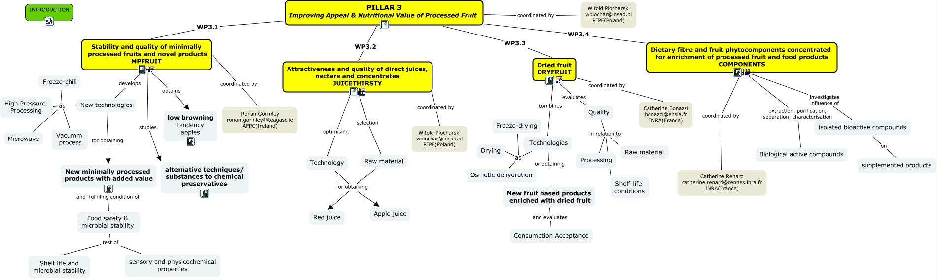 Isafruit's PILLAR 3, Attractiveness and quality of direct juices, nectars and concentrates JUICETHIRSTY optimising Technology, Stability and quality of minimally processed fruits and novel products MPFRUIT studies alternative techniques/ substances to chemical preservatives, Dried fruit DRYFRUIT coordinated by Catherine Bonazzi bonazzi@ensia.fr INRA(France), PILLAR 3 Improving Appeal & Nutritional Value of Processed Fruit coordinated by Witold Plocharski wplochar@insad.pl RIPF(Poland), isolated bioactive compounds on supplemented products, Technologies for obtaining New fruit based products enriched with dried fruit, Raw material for obtaining Red juice, PILLAR 3 Improving Appeal & Nutritional Value of Processed Fruit WP3.3 Dried fruit DRYFRUIT, Food safety & microbial stability test of sensory and physicochemical properties, Stability and quality of minimally processed fruits and novel products MPFRUIT obtains low browning tendency apples