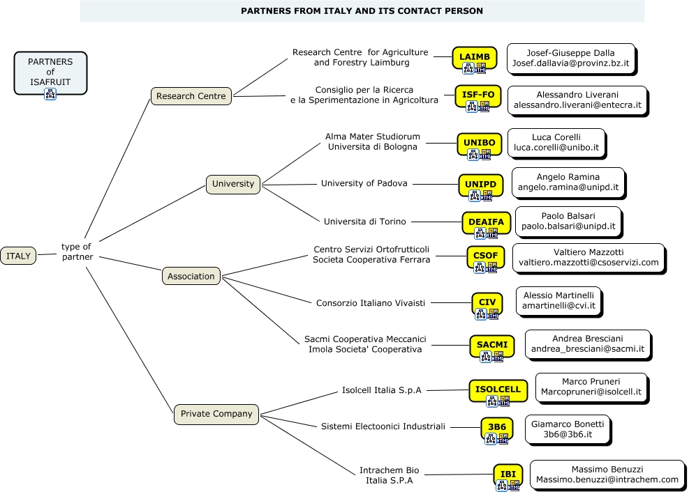 Italy, Association Consorzio Italiano Vivaisti CIV, Private Company Sistemi Electoonici Industriali 3B6, University Alma Mater Studiorum Universita di Bologna UNIBO, ITALY type of partner University, Association Sacmi Cooperativa Meccanici Imola Societa' Cooperativa SACMI, Research Centre Research Centre for Agriculture and Forestry Laimburg LAIMB, University University of Padova UNIPD, Research Centre Consiglio per la Ricerca e la Sperimentazione in Agricoltura ISF-FO, Private Company Intrachem Bio Italia S.P.A IBI, ITALY type of partner Research Centre