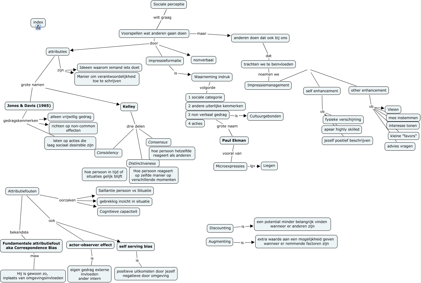 Deze Concept Map heeft informatie gerelateerd aan: sociale perceptie, Microexpressies igv Liegen, other enhancement vb mee instemmen, Augmenting is extra waarde aan een mogelijkheid geven wanneer er remmende factoren zijn, 3 non verbaal gedrag grote naam Paul Ekman, Impressiemanagement other enhancement, trachten we te beinvloeden noemen we Impressiemanagement, Attributiefouten ook self serving bias, Attributiefouten oorzaken Saillantie persoon vs Situatie, Kelley drie delen Consistency, other enhancement vb interesse tonen, other enhancement vb advies vragen, other enhancement vb kleine "favors", Kelley drie delen Consensus, attributies zijn Manier om verantwoordelijkheid toe te schrijven, other enhancement vb Vleien, self serving bias is positieve uitkomsten door jezelf negatieve door omgeving, Attributiefouten bekendste Fundamentele attributiefout aka Correspondence Bias, Kelley drie delen Distinctiveness, self enhancement vb jezelf positief beschrijven, Jones & Davis (1965) gedragskenmerken richten op non-common effecten