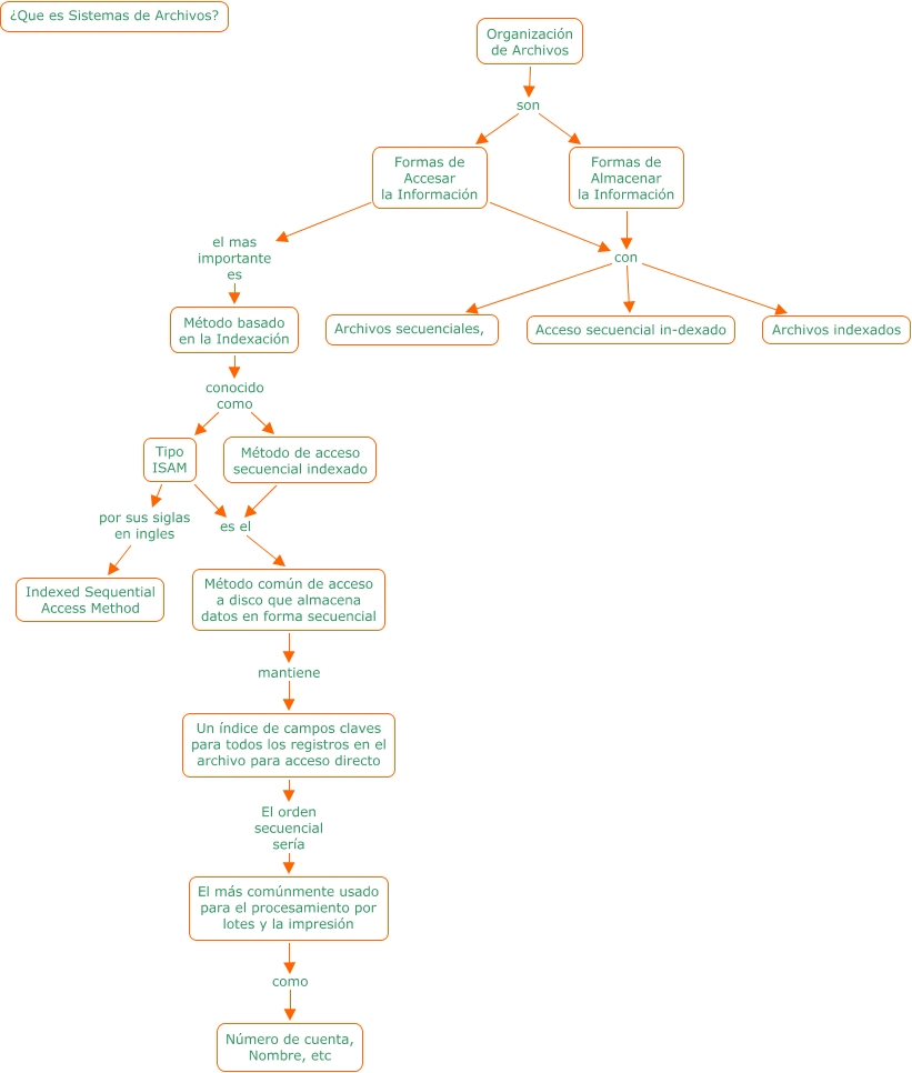 Este mapa conceptual tiene información relacionada a: Sistemas de Archivos, Organización de Archivos son Formas de Almacenar la Información, Un índice de campos claves para todos los registros en el archivo para acceso directo El orden secuencial sería El más comúnmente usado para el procesamiento por lotes y la impresión, Método basado en la Indexación conocido como Método de acceso secuencial indexado, Tipo ISAM por sus siglas en ingles Indexed Sequential Access Method, Formas de Accesar la Información con Acceso secuencial in-dexado, Formas de Almacenar la Información con Archivos indexados, Formas de Almacenar la Información con Acceso secuencial in-dexado, Formas de Almacenar la Información con Archivos secuenciales,, Formas de Accesar la Información con Archivos indexados, Método de acceso secuencial indexado es el Método común de acceso a disco que almacena datos en forma secuencial, Formas de Accesar la Información con Archivos secuenciales,, Método basado en la Indexación conocido como Tipo ISAM, Tipo ISAM es el Método común de acceso a disco que almacena datos en forma secuencial, El más comúnmente usado para el procesamiento por lotes y la impresión como Número de cuenta, Nombre, etc, Método común de acceso a disco que almacena datos en forma secuencial mantiene Un índice de campos claves para todos los registros en el archivo para acceso directo, Organización de Archivos son Formas de Accesar la Información, Formas de Accesar la Información el mas importante es Método basado en la Indexación