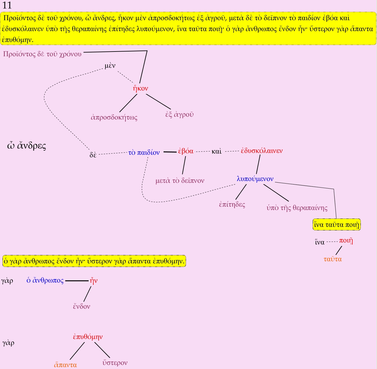 Este Cmap, tiene información relacionada con: frag.11, ἐξ ἀγροῦ ???? ἧκον, ὕστερον ???? ἐπυθόμην, μὲν ???? δὲ, μετὰ τὸ δεῖπνον ???? ἐβόα, λυπούμενον ???? ἐδυσκόλαινεν, λυπούμενον ???? τὸ παιδίον, ἐδυσκόλαινεν ???? καὶ, μὲν ???? ἧκον, ἀπροσδοκήτως ???? ἧκον, Προῖόντος δὲ τοῦ χρόνου ???? ἧκον, τὸ παιδίον ???? ἐβόα, ταῦτα ???? ποιῇ, ὁ ἄνθρωπος ???? ἦν, ἅπαντα ???? ἐπυθόμην, καὶ ???? ἐβόα, ἐπίτηδες ???? λυπούμενον, ἵνα ???? ποιῇ, δὲ ???? τὸ παιδίον, ἔνδον ???? ἦν, ὑπὸ τῆς θεραπαίνης ???? λυπούμενον