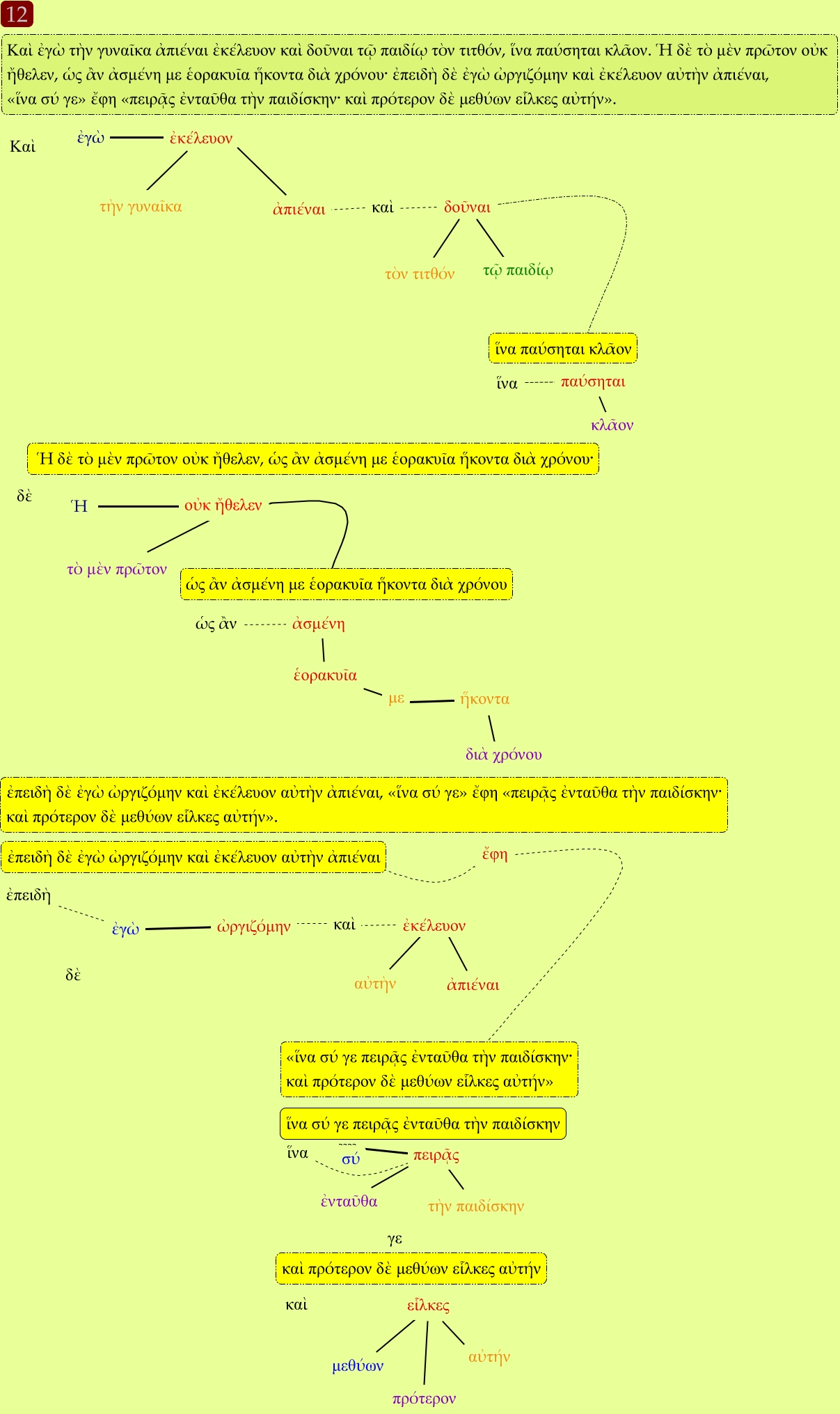 Este Cmap, tiene información relacionada con: frag.12, Ἡ ???? τὸ μὲν πρῶτον, ἐγὼ ???? ὠργιζόμην, μεθύων ???? εἷλκες, ἐπειδὴ ???? ἐγὼ, ἵνα ???? πειρᾷς, ἀπιέναι ???? ἐκέλευον, ἑορακυῖα ???? με, δοῦναι ???? τὸν τιτθόν, ἐκέλευον ???? τὴν γυναῖκα, δοῦναι ???? ἵνα παύσηται κλᾶον, ἥκοντα ???? με, οὐκ ἤθελεν ???? ὡς ἂν ἀσμένη με ἑορακυῖα ἥκοντα διὰ χρόνου, ἐκέλευον ???? ἐγὼ, δοῦναι ???? καὶ, δοῦναι ???? τῷ παιδίῳ, ἐκέλευον ???? καὶ, ἐνταῦθα ???? πειρᾷς, ἔφη ???? «ἵνα σύ γε πειρᾷς ἐνταῦθα τὴν παιδίσκην· καὶ πρότερον δὲ μεθύων εἷλκες αὐτήν», ὡς ἂν ???? ἀσμένη, Ἡ ???? οὐκ ἤθελεν